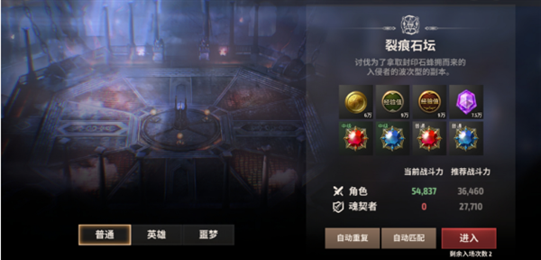 裂痕祭坛同样也是1天可入场2次,一般难度只要完成章节2-16就可参与。