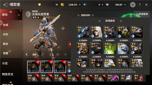 消耗一定金币点击[合成]按钮后,可以随机得到更高一星级、同主材料类型的任意魂契者。在界面右上角可以点击查看得到各种魂契者的概率。