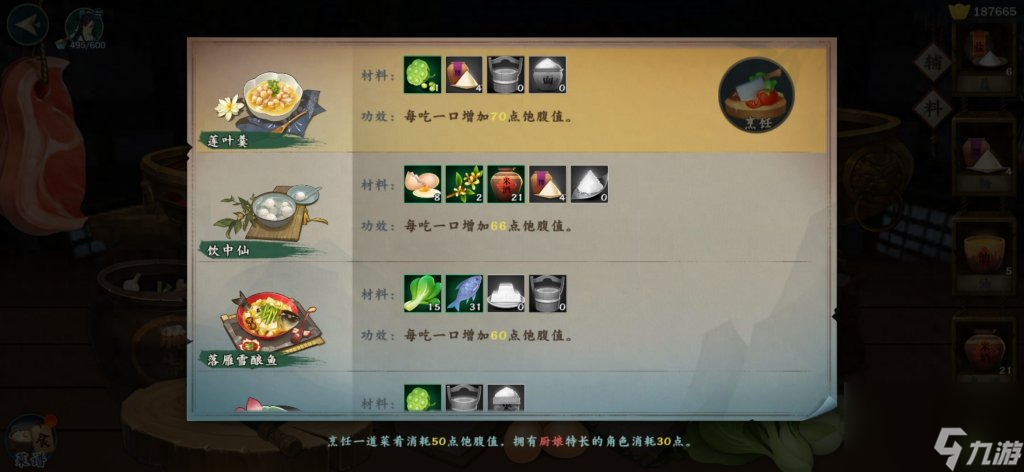 一般的侠客在做菜需要消耗50饱腹值,有厨娘特长只需要消耗30饱腹值,所以在做菜时记得切换侠客,能少20饱腹值也相当于减少200金币的做菜成本了。如果不知道做菜的配方,可以去各地图多转转,当你发现某个NPC头上有个“奇”字时,过去交流就能获得配方了。