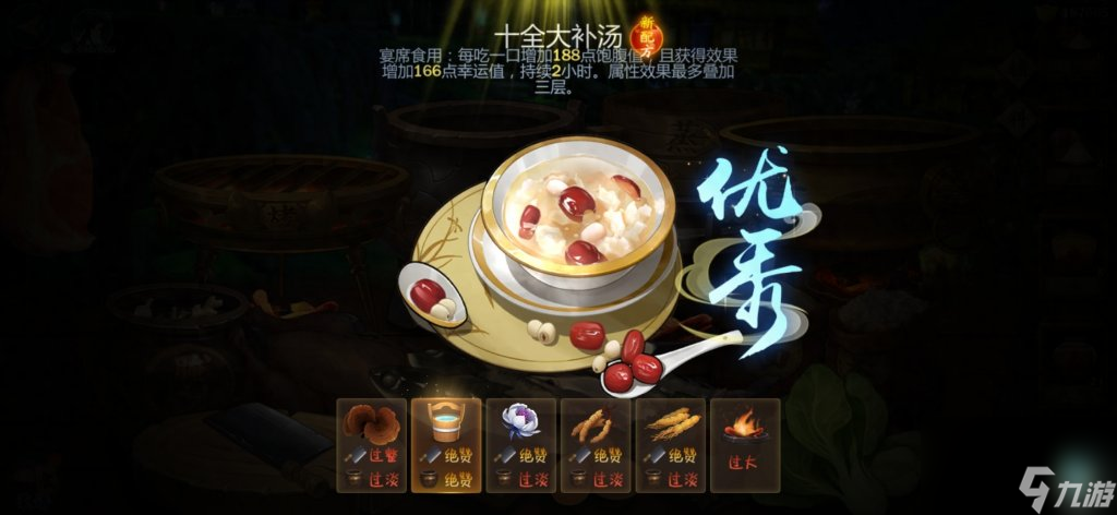 剑网3指尖江湖中增加饱腹值最多的菜是十全大补汤,可以增加564的饱腹值。不过成本也是非常高的,需要灵芝、雪莲、人参、虫草以及井水,做一次的成本就需要7000金左右,也就是10饱腹值大概需要130金。捡一次绿色材料是需要10饱腹值,底价是200金币,紫色材料是一千,需要50饱腹值,如果捡的材料只能卖个底价,其实挣的并不多。
