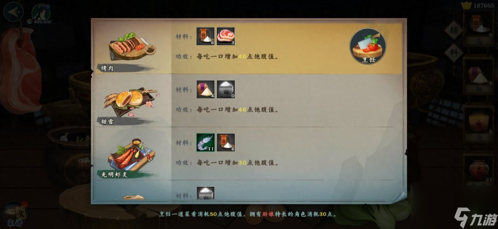 相比之下,如果只是为了增加饱腹值的话,另外一道菜“素银夹花”的成本要低很多。这道菜需要的材料是:虾、井水、面、鸡,其中,第一样材料可以在野外有水的地方捕捉,后几样可以在烹饪商店购买,总成本在2100金币左右,能增加249的饱腹值,除去做菜消耗的饱腹值,10饱腹值大概需要96金币。也就是说,哪怕你捡到最不值钱的紫色材料,一个也能挣六七百金币。