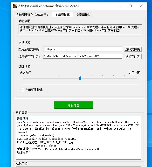 2、全图清晰化对任意图进行清晰化处理,人脸部分采用codeformer算法处理,非人脸部分使用basicSR处理。适用于deepfacelab合成环节merge文件夹里的图,不适用aligned文件夹里的图