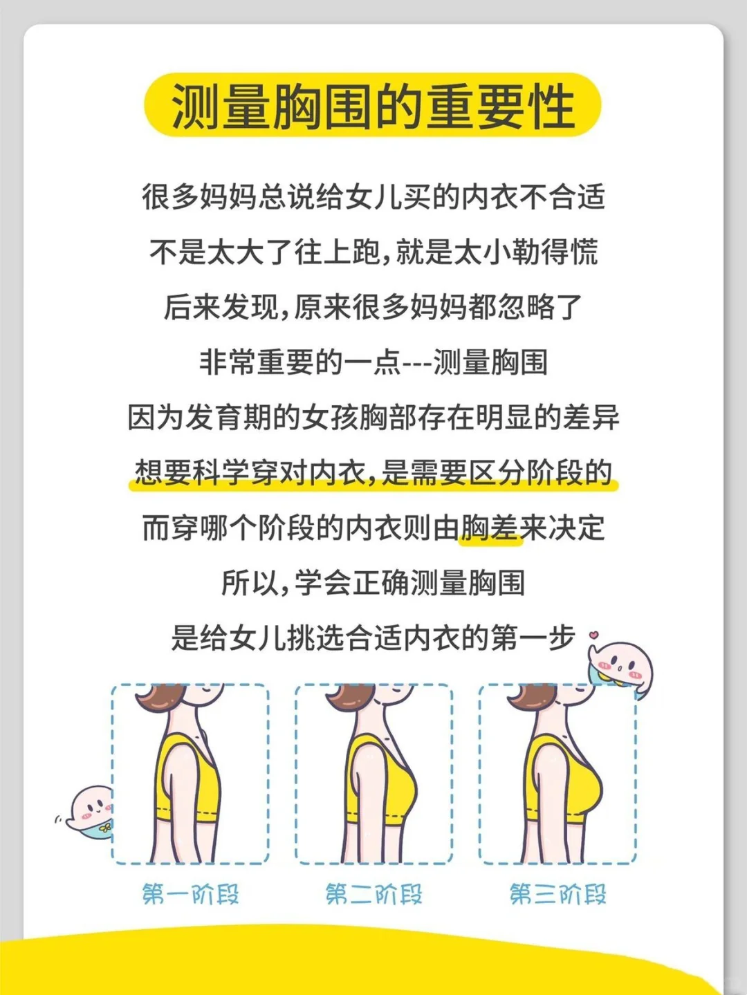 因为发育期的女孩👧🏻胸部存在很明显的差异呀。✨想要科学穿对内衣,其实是需要区分阶段的✨,而穿哪个阶段的内衣是由【胸围差】来决定的哦。所以给女儿购买内衣前,先测量胸围是超级必要的呢,这可是挑选合适内衣的第一步🌱。一旦选对了合适的内衣,就能给胸部带来很好的支撑和保护🤗啦。
