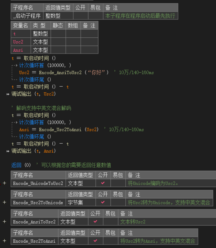 补足了精易模块遇到中英文混合Usc2解码会乱码问题,速度比精易的快800+倍(简易测试)
