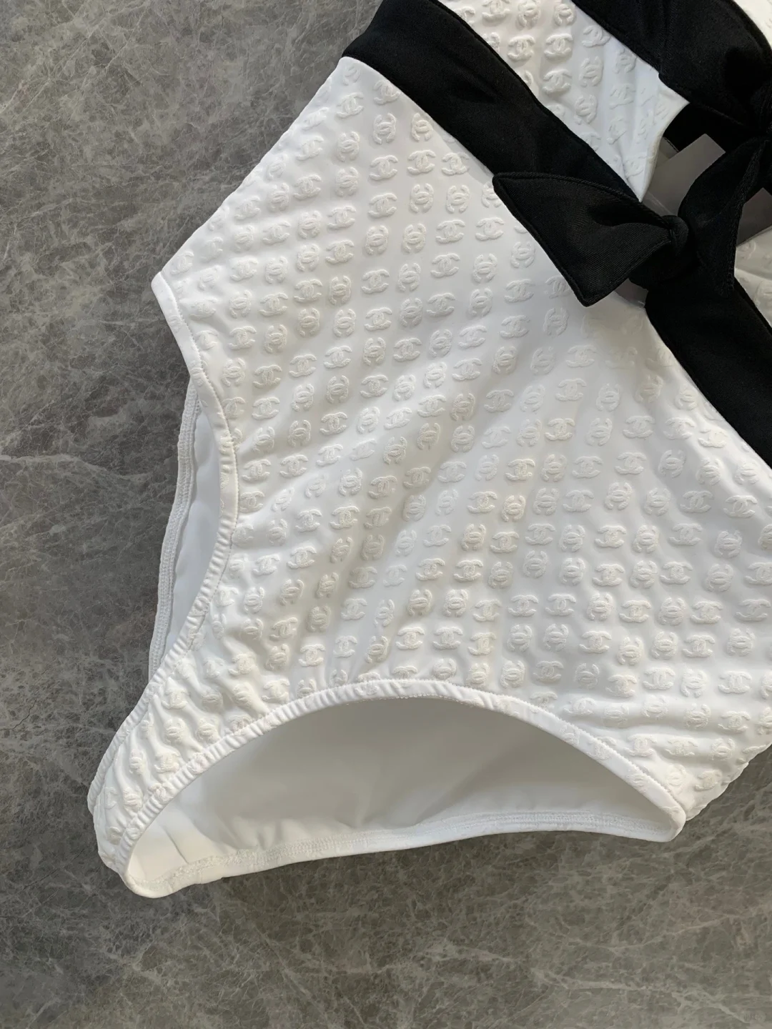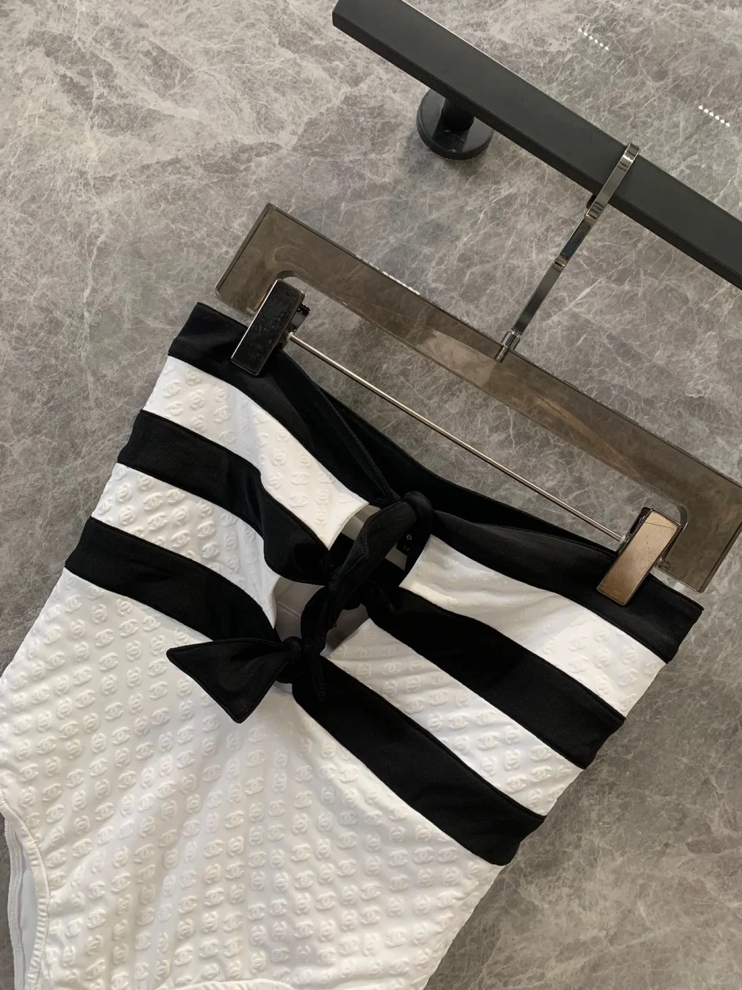 Chanel条纹蝴蝶结暗纹连体泳衣