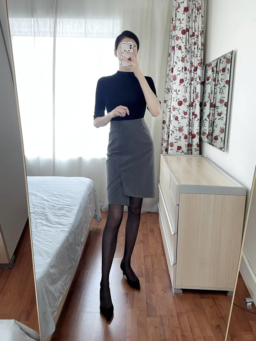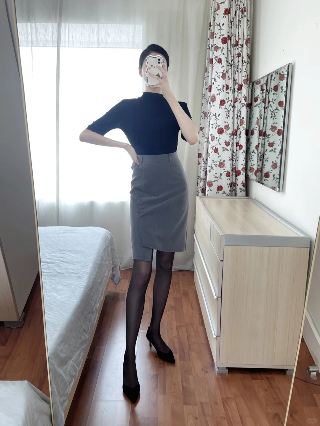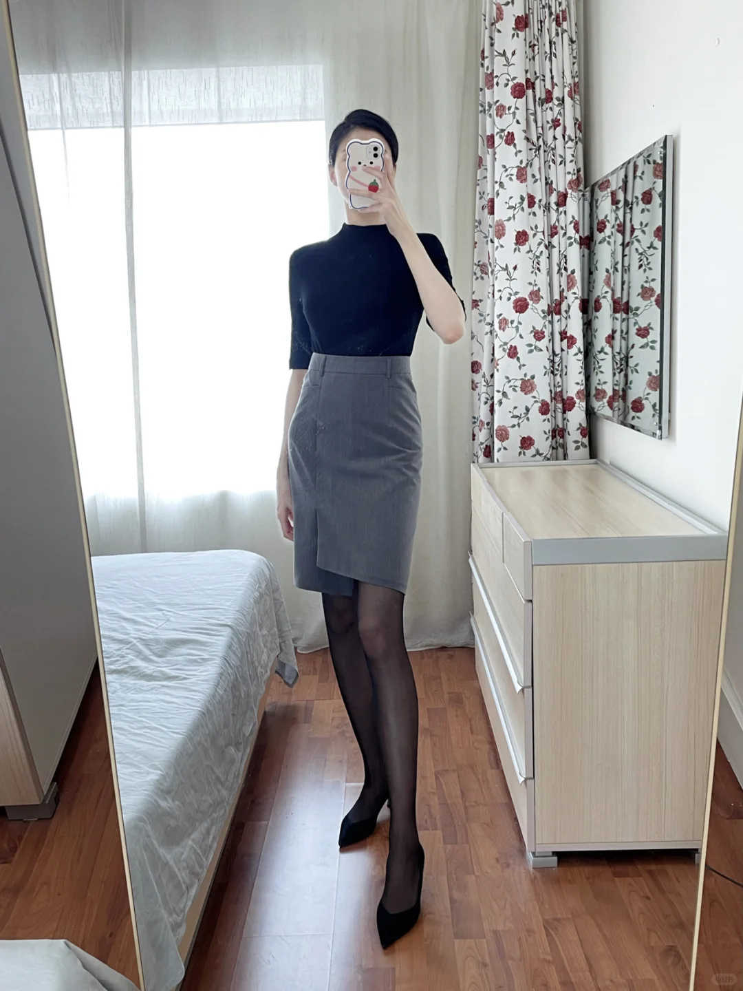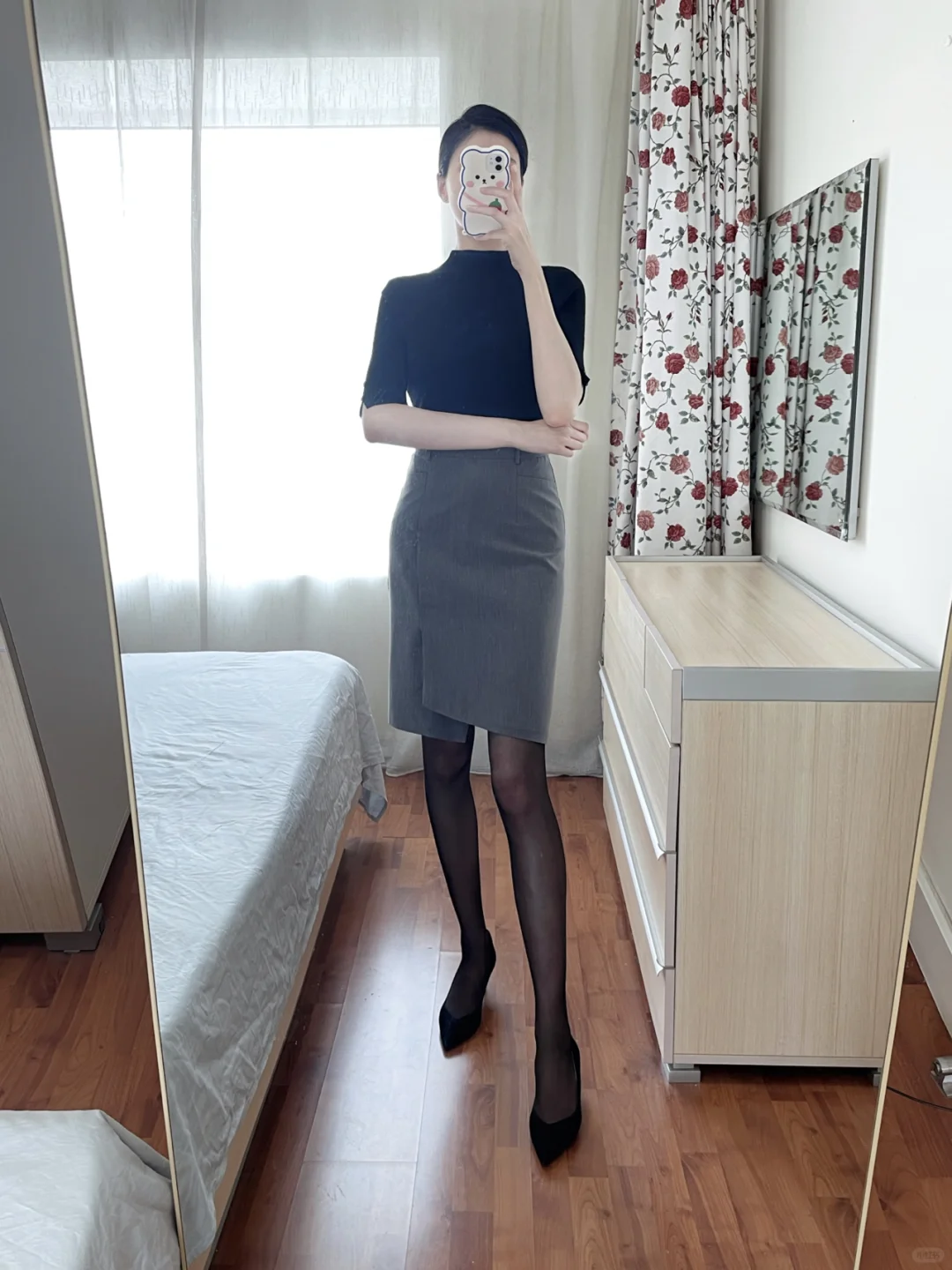 搭配灰色半身裙和黑丝 优雅职场OL范儿