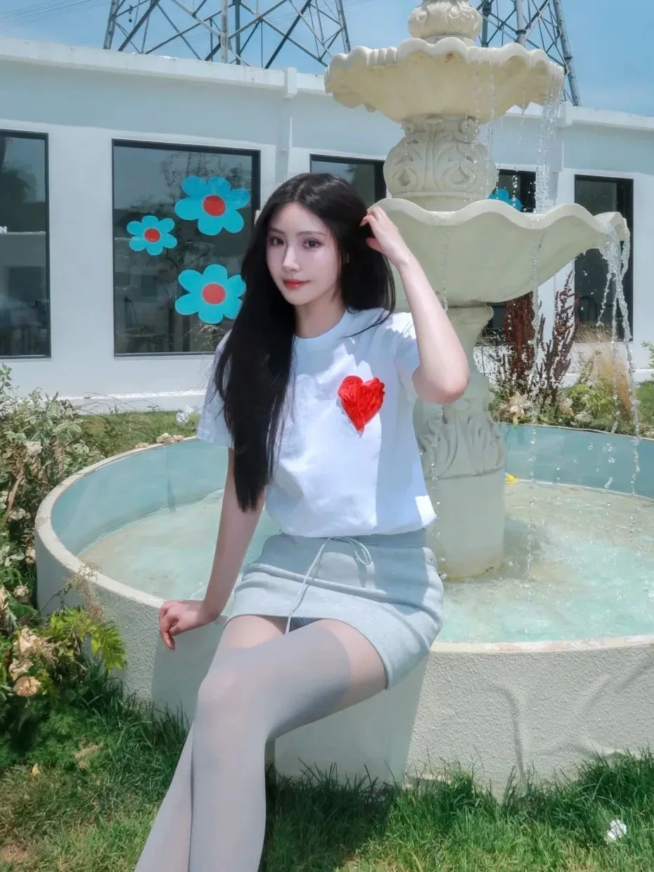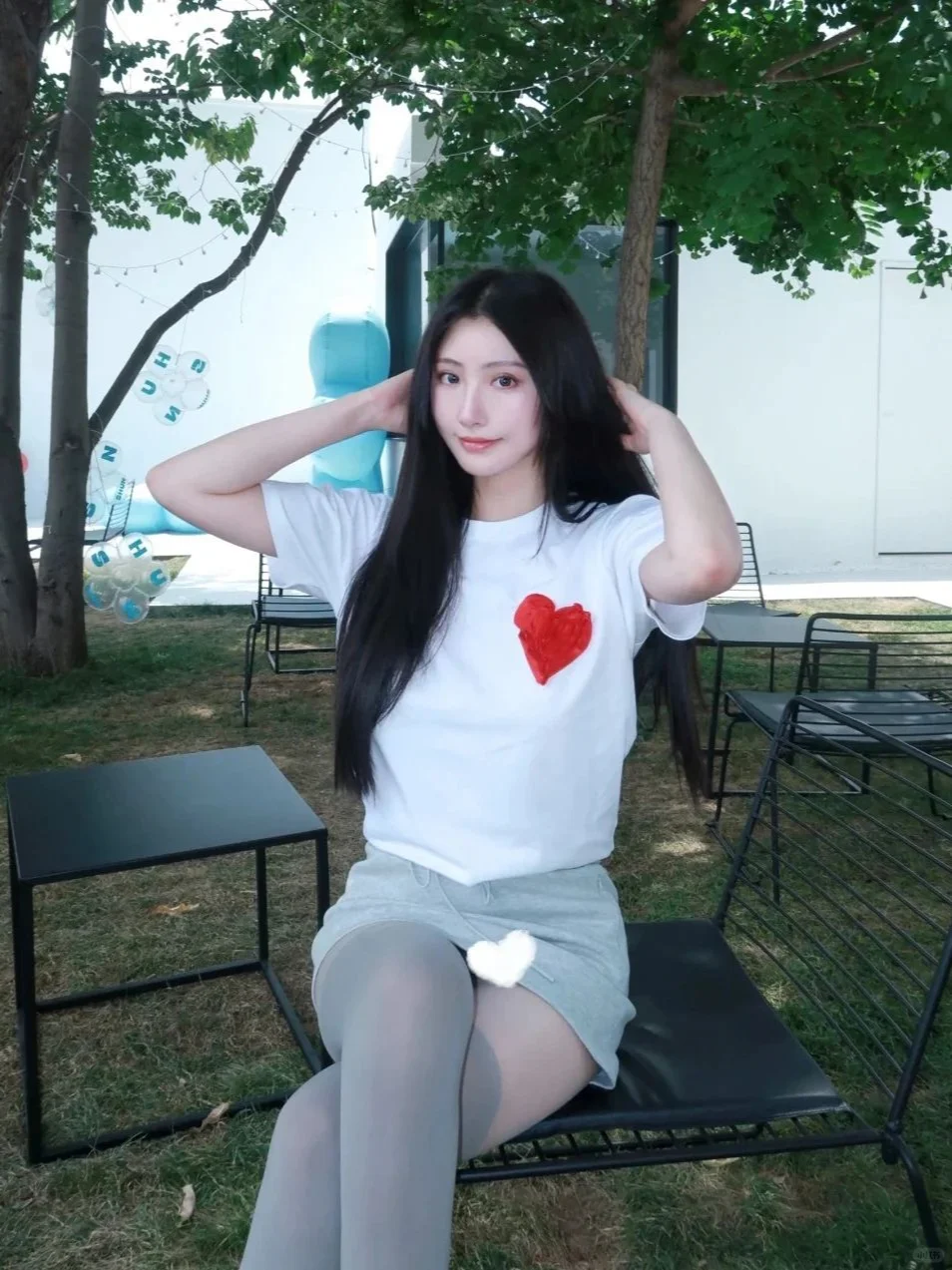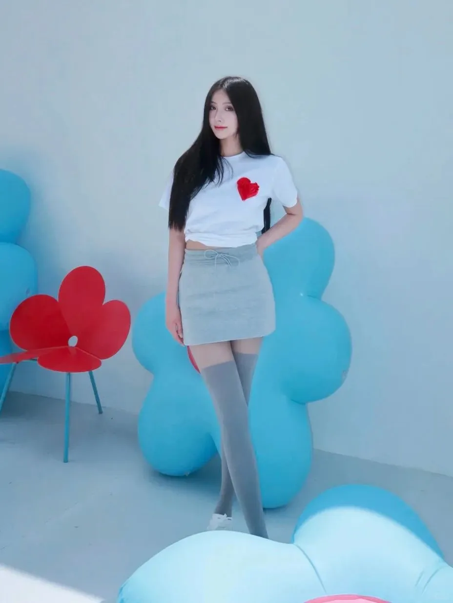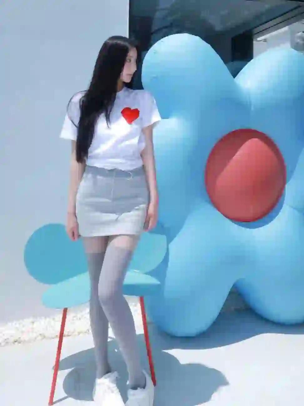 【色系】:白色+灰色 【丝袜】:灰色双拼丝袜 【穿搭】:白色短袖T恤+灰色超短裙++灰色双拼丝袜+白色运动鞋