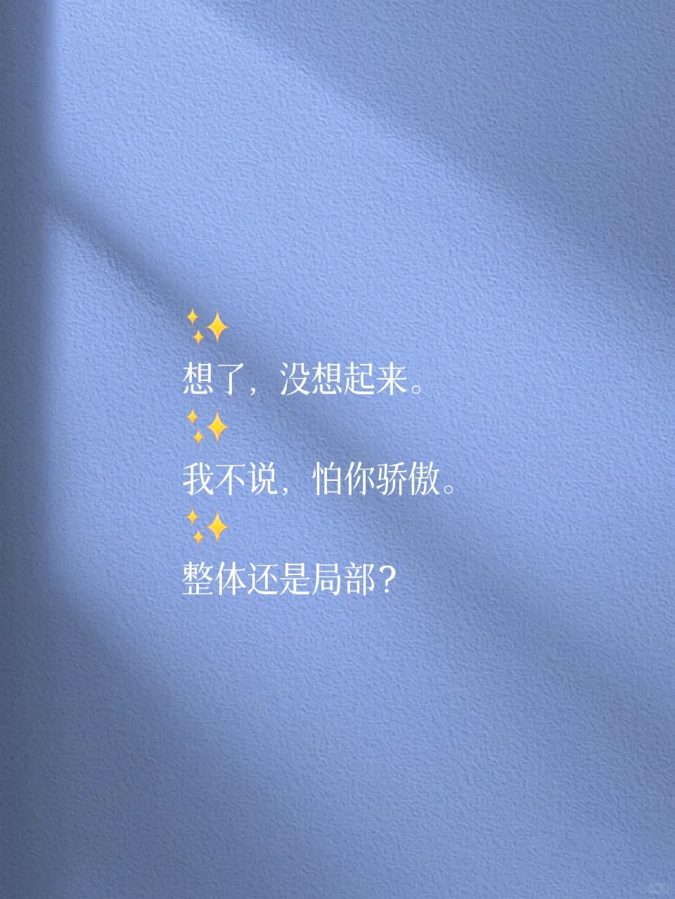 想了,没想起来。 我不说,怕你骄傲。 整体还是局部? 想你有什么奖励嘛? 想知道答案,就来当面问。 想得吃不下筷子咽不下碗。 V我520告诉你。 我今天除了呼吸就是想你。 晚点再来问一遍,快轮到你了。 如果想你收费,我已负债累累了。 嘴上你比我快,心里你比我慢。 不敢想,一想全是马赛克。