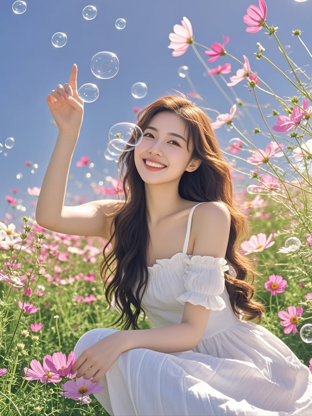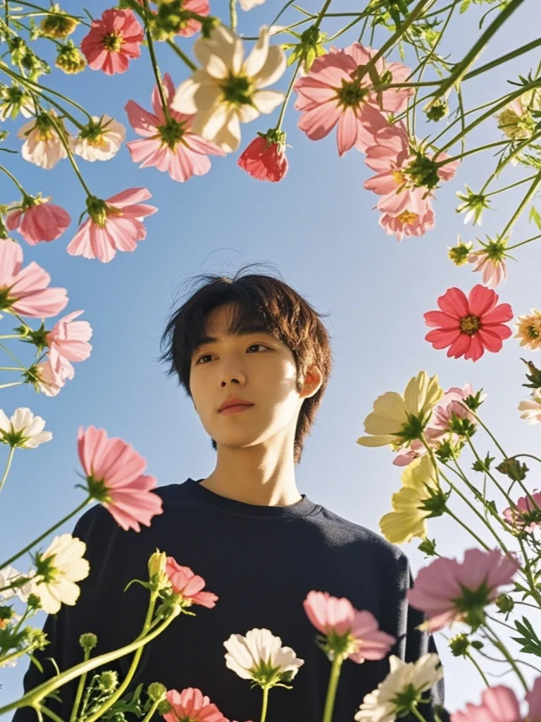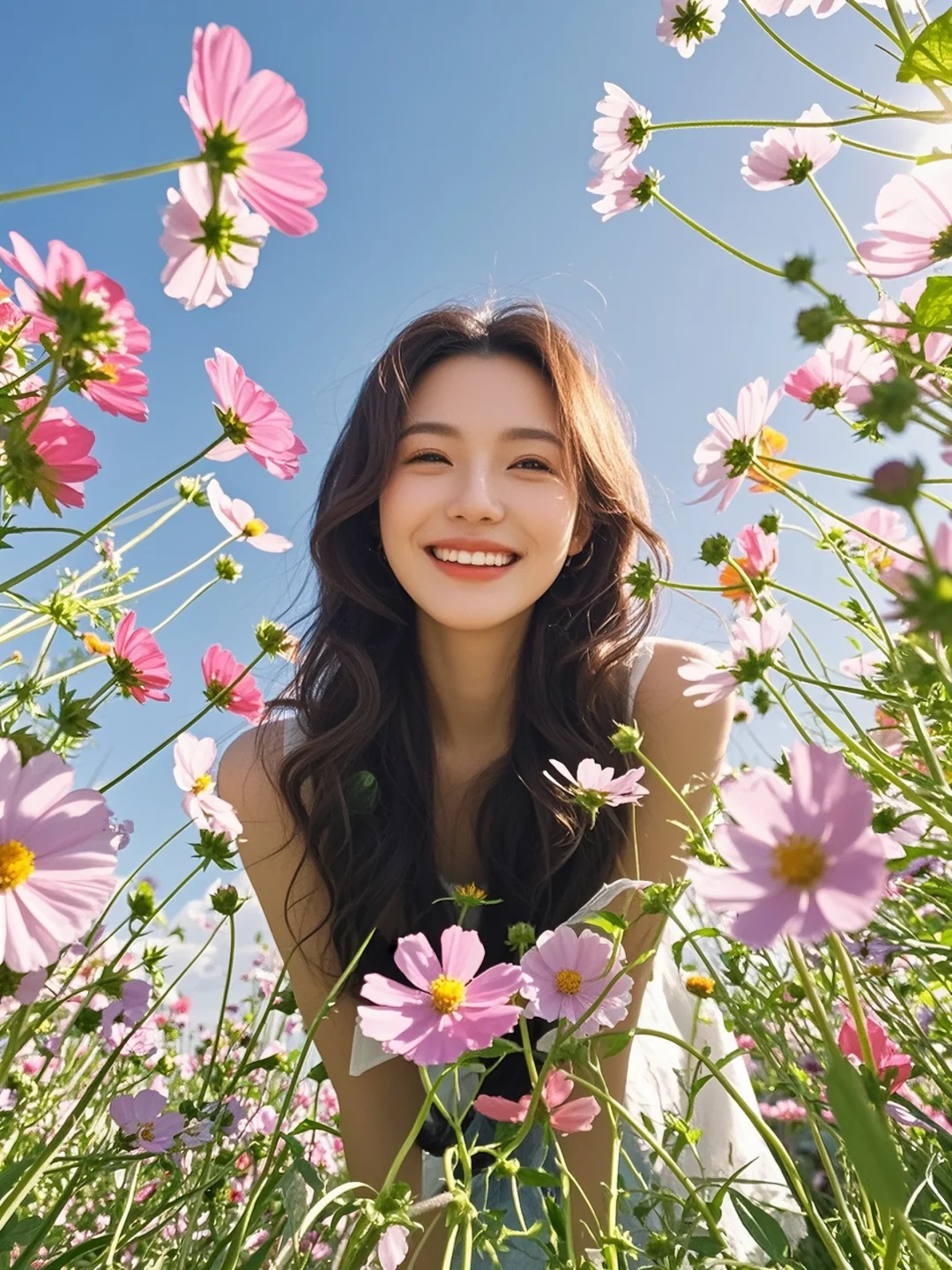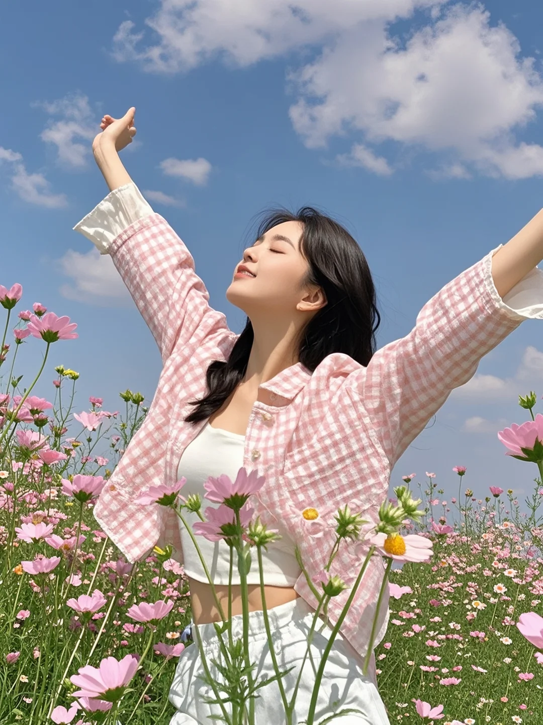 🍁关键词:花海,女性人物夏季薄款穿休闲粉白色格子外套,举起双手拥抱天空,前景下部1/3为较密集花朵,上部为人物,慵懒闭眼,惬意,下方仰视视角拍摄,离镜头2m,画面清晰通透,蓝天白云 ——这里只放了图2的关键词最后一张图有其他的。