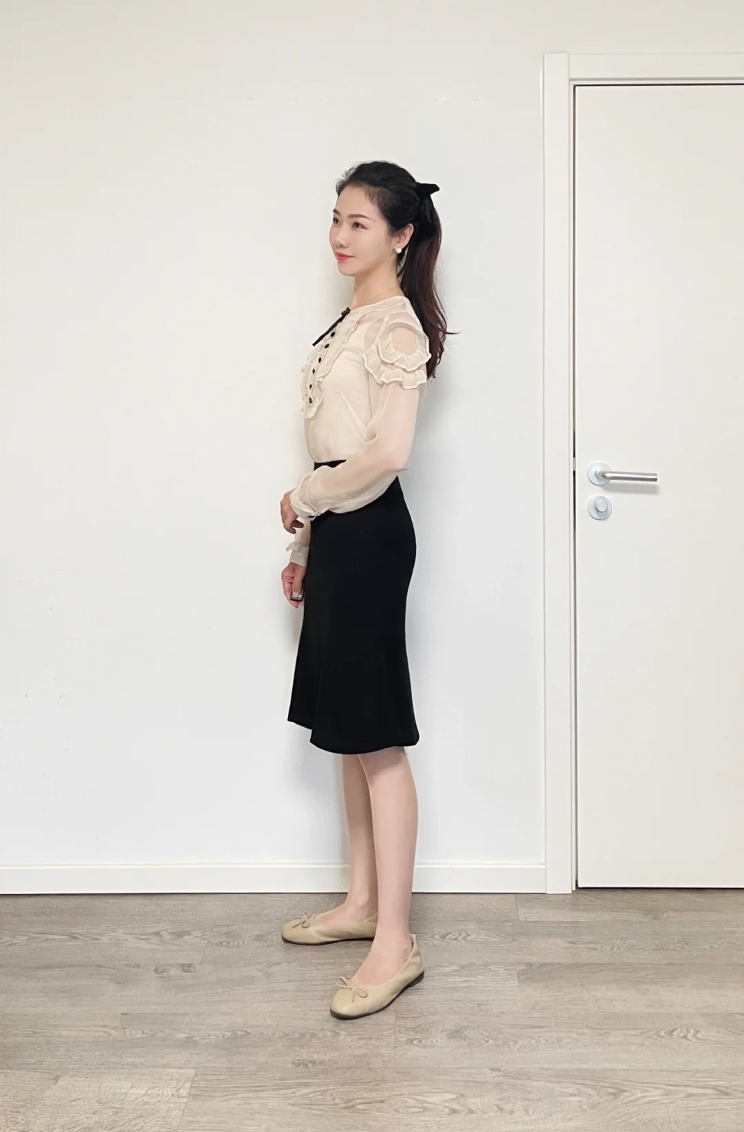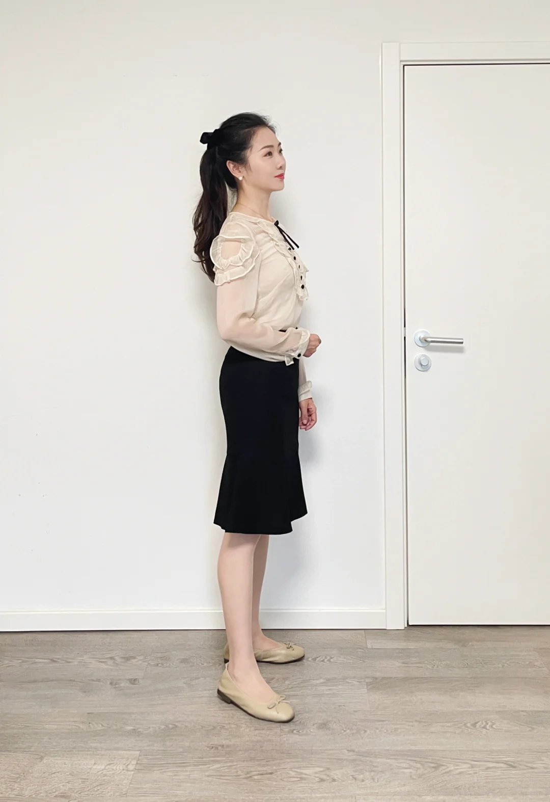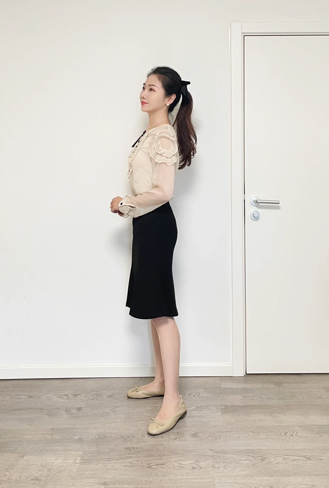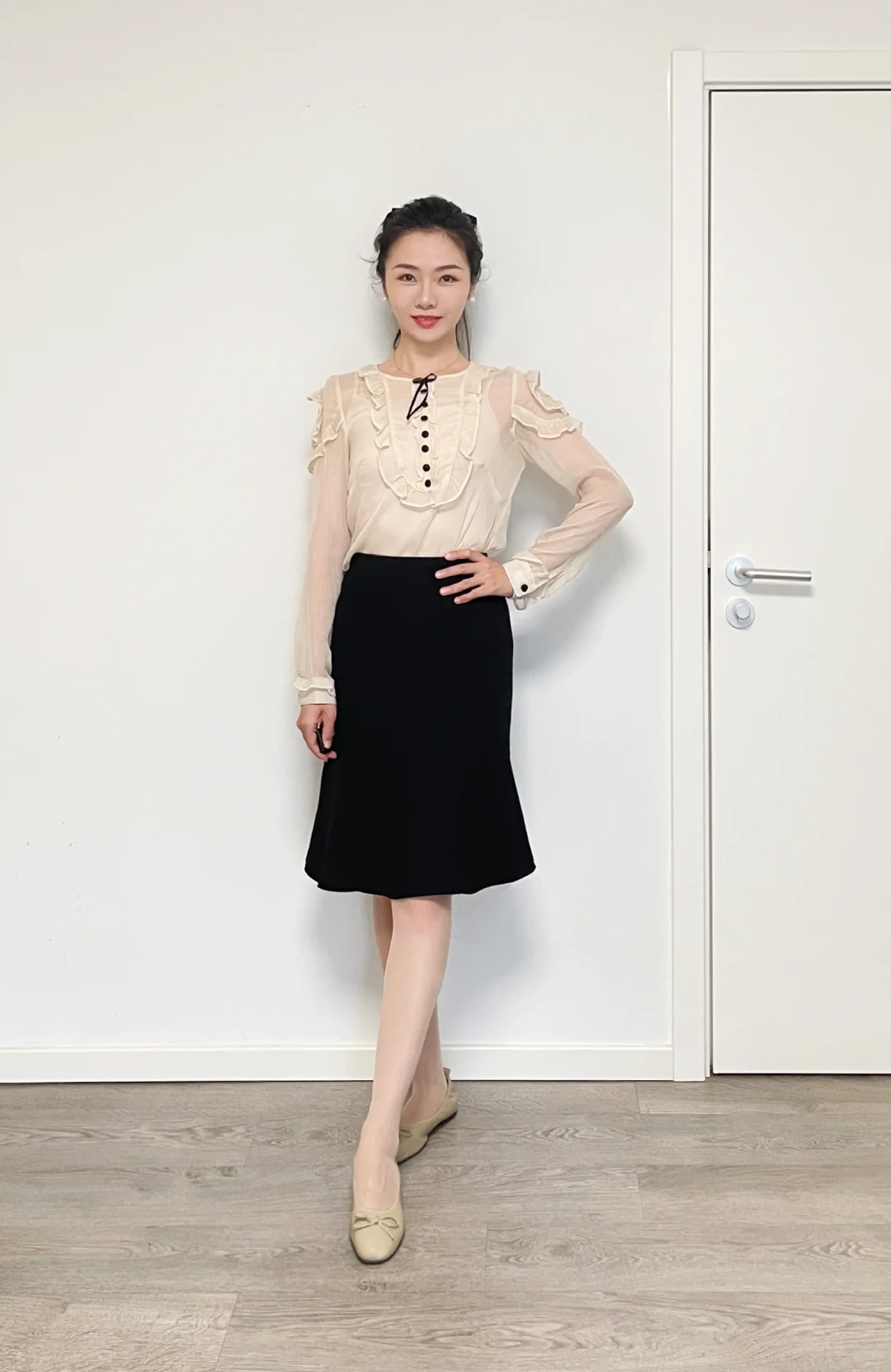 不显得很“职场”的职场穿搭,试图在秩序中做出微小的改变。 这件上衣肩膀处的荷叶边设计增添了几分浪漫气息,这种透视上衣多见于韩国女装和泰国女装,很有女人味,因为有内衬所以上班穿也不会太性感突兀。 半裙带一点荷叶边,和上衣相呼应,不是包臀裙,对身材限制没那么死。