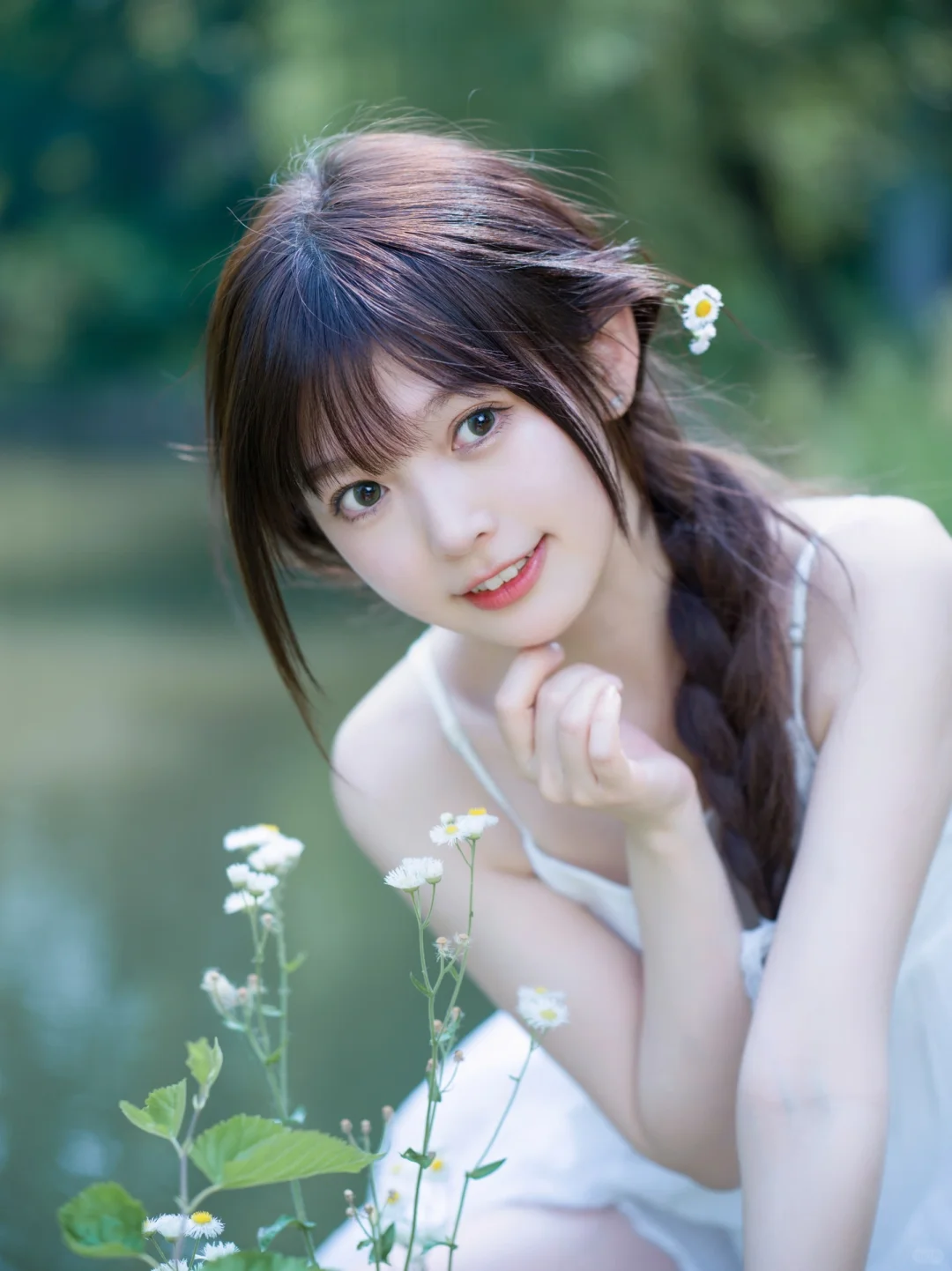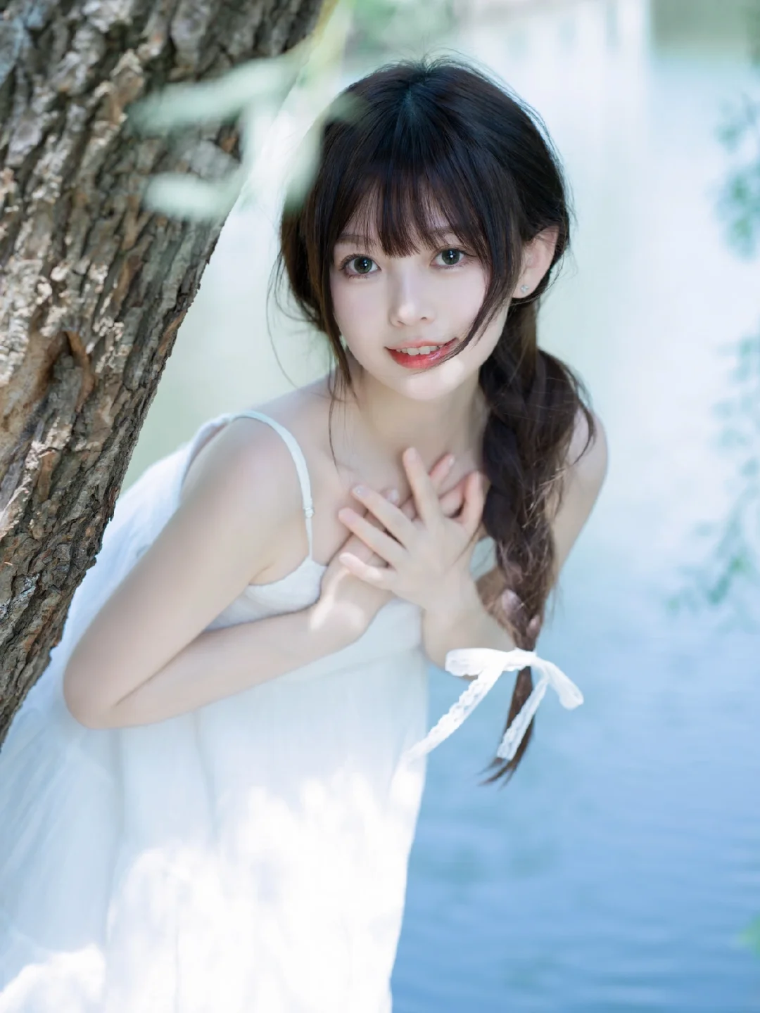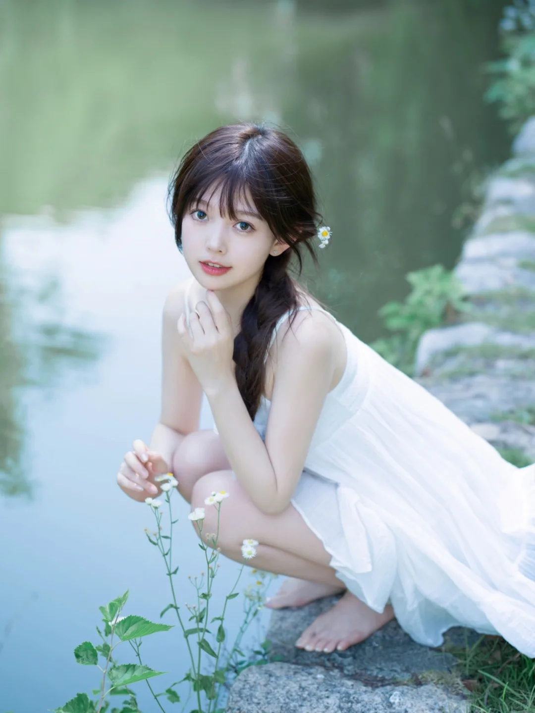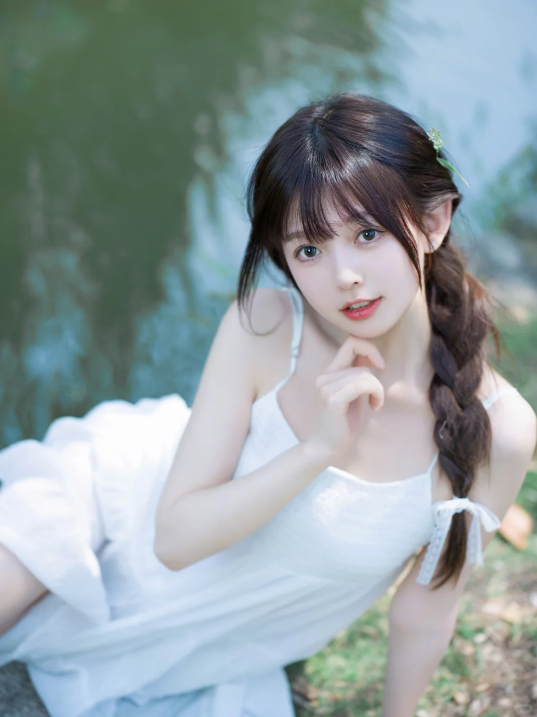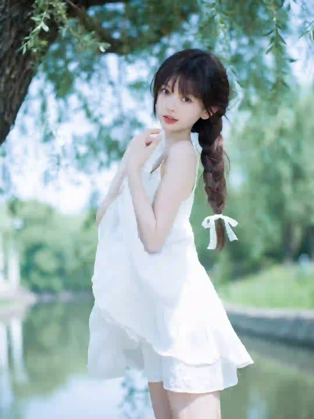 湖边拍摄注意安全,无不良导向。 喜欢简单干净的小白裙。