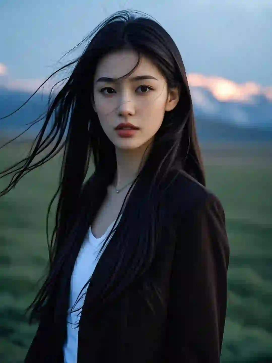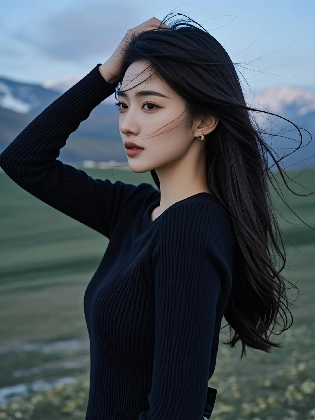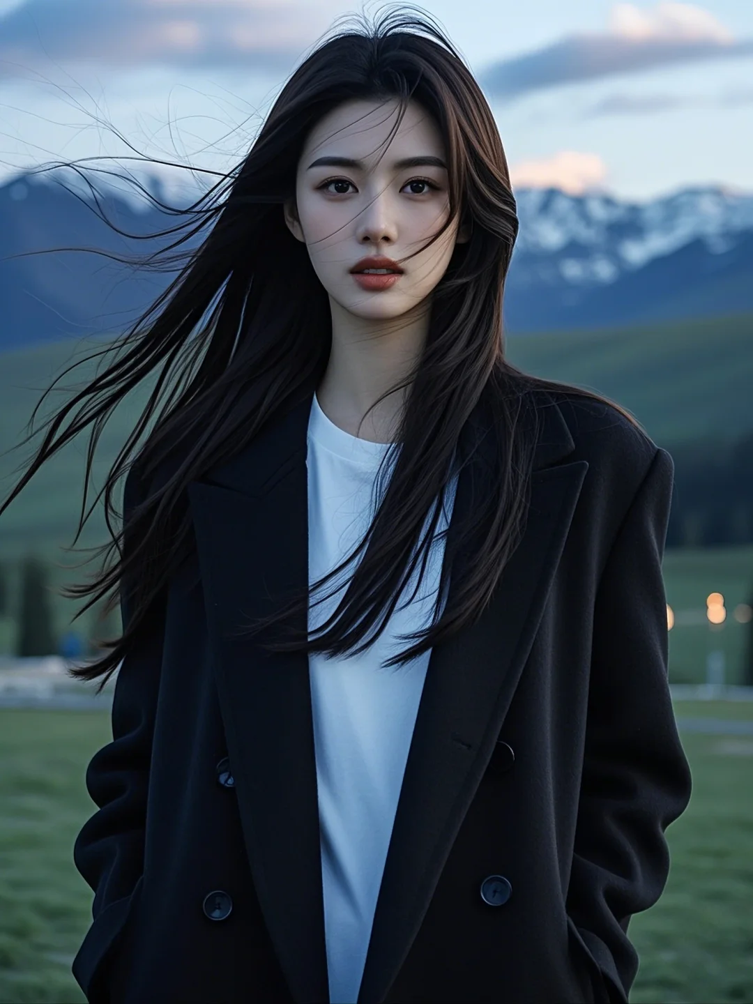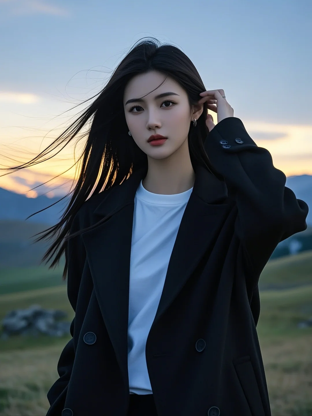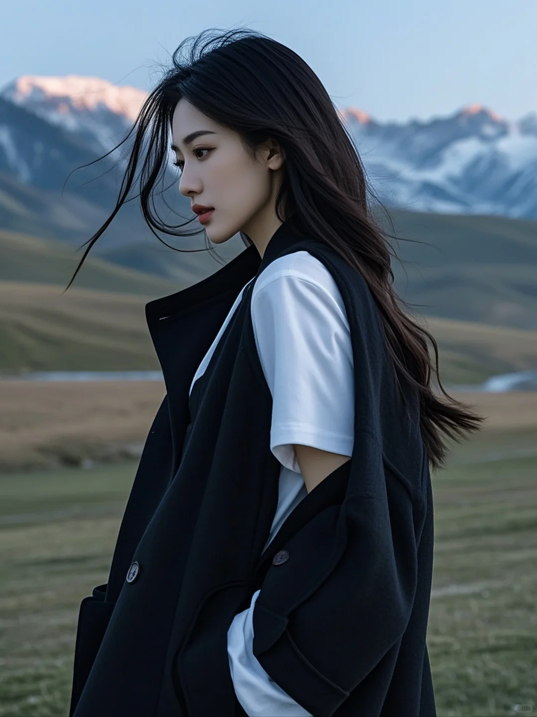 💫在伊犁的琼库什台,傍晚的夜色如同一幅神秘的画卷缓缓展开。暗调的氛围中,一位气质美女身着黑色尼大衣,敞开的衣襟随风飘动,内搭的白色 T 恤简洁而纯粹。