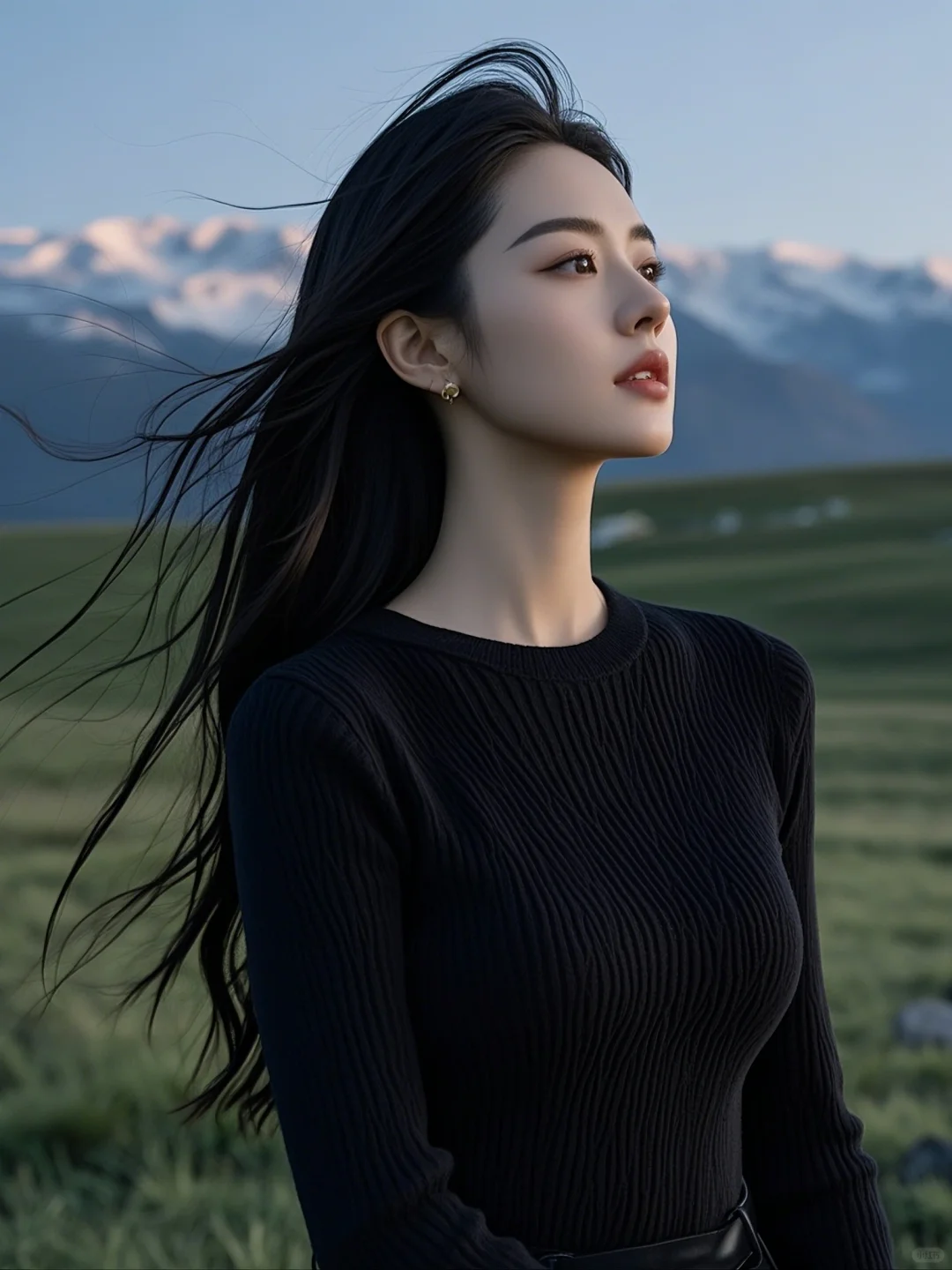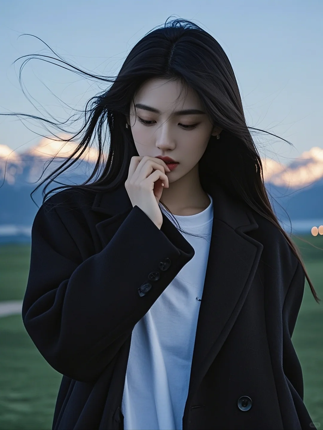 #AIGC #琼库什台 #傍晚夜色 #黑色尼大衣 #人像摄影 #高级氛围感#美出了高级感