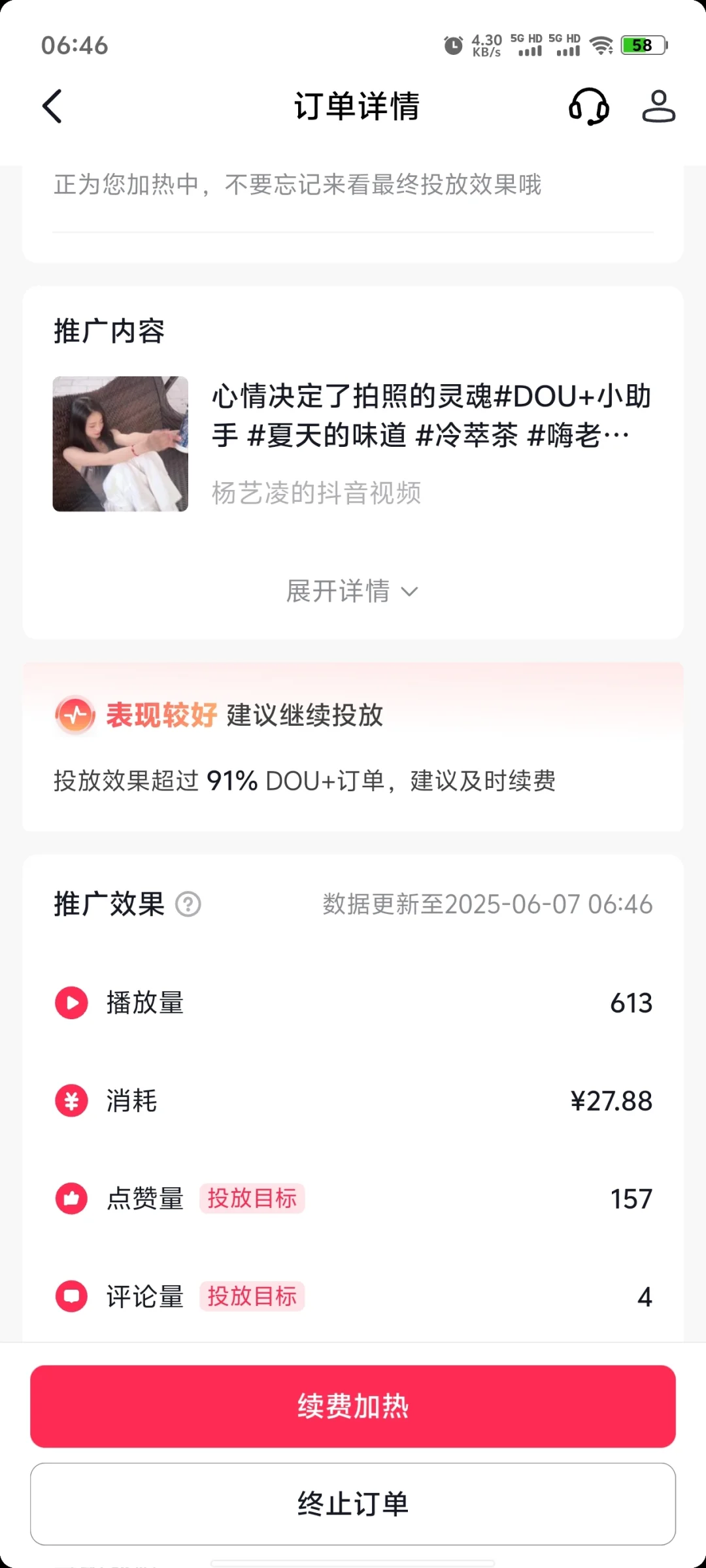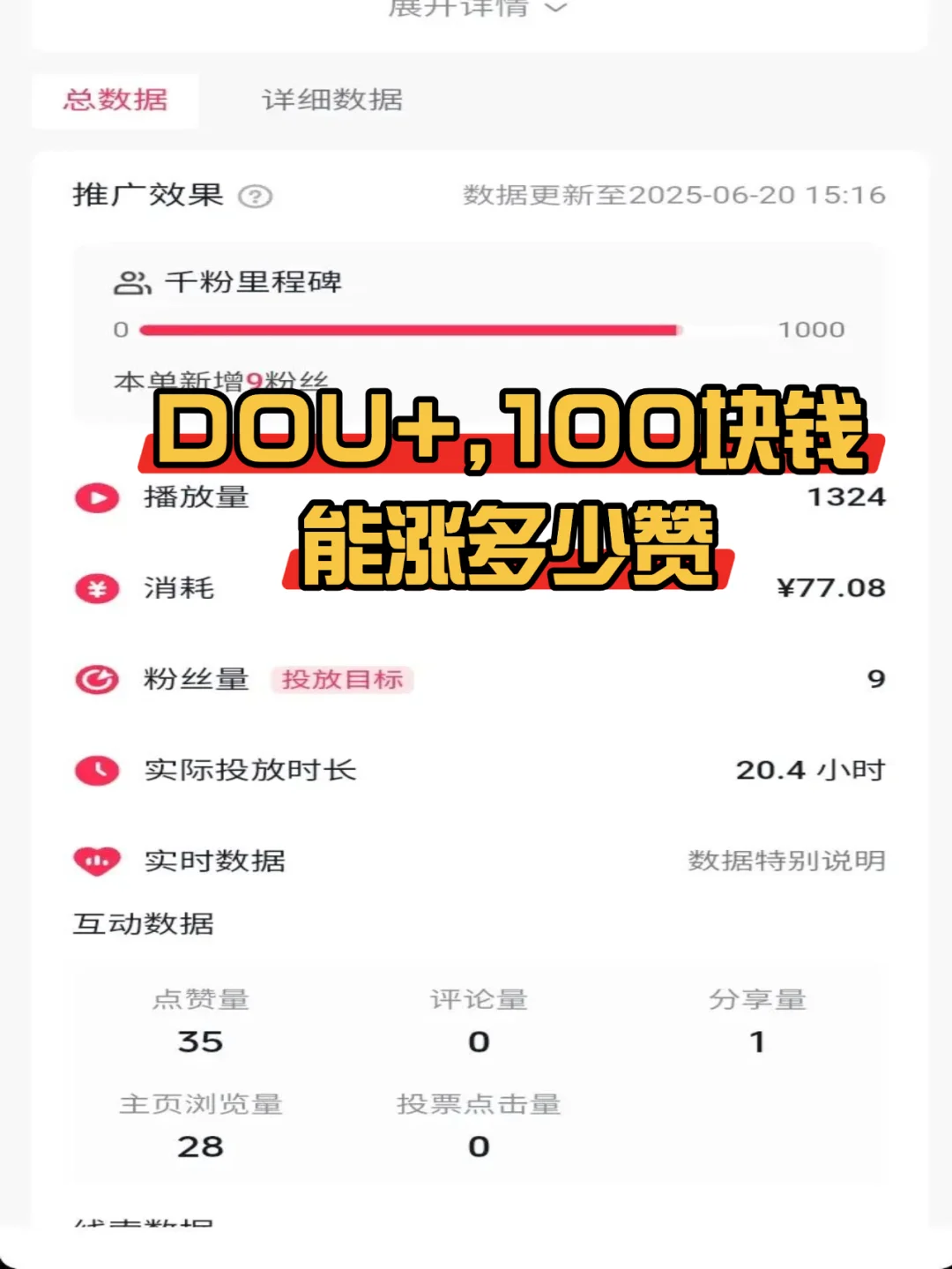 昨天下午三点,喝着冰美式脑子发热,给一条 Vlog 砸了 99 元 Dou+。\n脑补画面:播放破万,点赞狂飙,粉丝噼里啪啦往里跳。\n现实给我三行冷数据:\n播放 1324 |赞 35|粉丝 9\n---\n疯狂刷新后台,数字稳得像钉子,心情直线坠机。\n这钱花得像给抖加请客——“把寂寞加厚一百倍”。\n---\n💡 想让 100 块值回票价?\n试试下方商品卡「精zhun投流」👇\n同样预算,定位肯点赞+愿关注的人,\n别再让钱包陪你 emo!\n#抖加怎么投 #抖音投流 #投流实测 #自媒体避坑 #运营碎碎念 #谢谢我的粉丝 #dou #抖加 #暑假来和游戏过 #5分钟田野