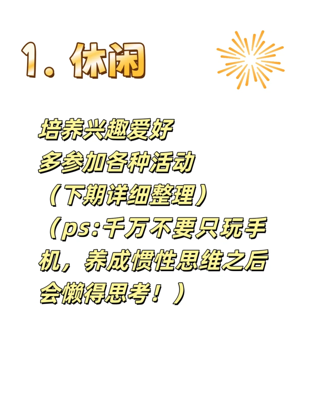 哈喽,我是一名女高中生,目前因为心理原因暂时休学调整(=^▽^=)今天来分享一下休学在家每天可以干些什么。\n我觉得休学在家的活动可以主要分为几个板块:休闲+健康+学习。\n🔆休闲\n很多小伙伴都是因为压力太大,抑郁焦虑而选择休学的,那我们这段时间首先就要好好的调剂心理,好好放松。相信大家的首选都是手机哈哈哈,这个当然可以,但是也要适量。除了手机之外也有一些其他活动推荐:\n可以出去旅游、做手工……(字数有限制,下一期会专门出一个帖子讲!)\n🔆健康\n【心理健康】\n如果医生开了药的,一定要 每天坚持吃药❗️坚持吃才有改善!(我之前吃的断断续续效果就不怎么好,现在坚持吃感觉变化很明显)\n【身体健康】\n1. 要尽量调整生物钟。有的药物可能会有嗜睡的副作用,但我们还是要尽量调整,最好的情况是每天晚上12点之前睡,第二天上午九点左右起。\n2.每天至少做一些简单的活动。最好当然是每天都能外出走走(10分钟也好!),如果不愿意出门,也可以在房间里面做一些简单的活动。\n🚫:不要经常一整天都瘫在床上(经常不动,再加上吃药心肺真的会变得很差!亲测!)\n很久没运动的小伙伴刚开始的时候不要太猛,要慢慢适应!\n🔆学习\n刚开始可以好好放松,但是之后最好开始慢慢的恢复学习哦(但是如果心理状态太差了就不要硬逼自己)\nTips: 刚开始可以每天1小时,有能力的话可以把时间慢慢过渡的越来越长(^-^)\n不用生硬的写题目背记,比如语文可以只从练习写话、记录生活开始,英语可以从看看英语视频开始,慢慢过渡慢慢培养。\n总之大家不要苛求自己太过完美,也不要过于放纵导致无法收心~ 慢慢来,按照自己的节奏调整。\n#对抗焦虑症 #抗抑 #抑郁症 #休学 #你也不用做满分小孩