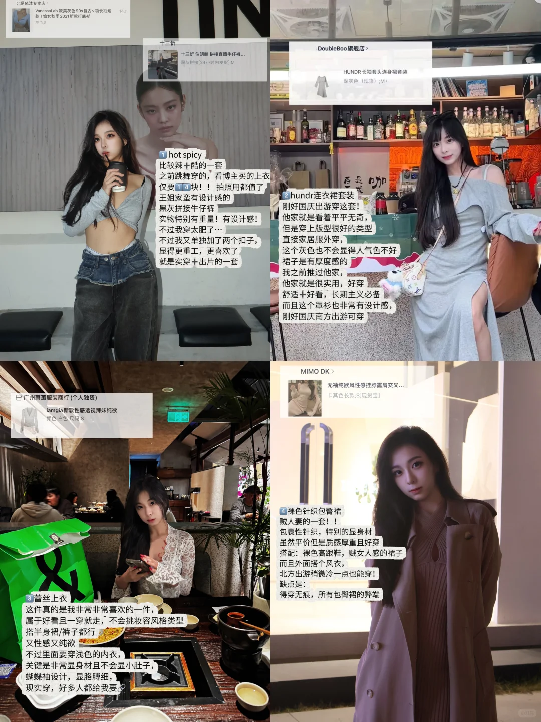 国庆出片📷|好看出片且实穿的衣服\n-\n之前有宝宝让我出的国庆出去玩的一些衣服!\n主打的是:好看出片➕实用\n-\n1⃣️ hot spicy\n比较辣➕酷的一套\n之前跳舞穿的,看博主买的上衣\n仅要1⃣️4⃣️块!! 拍照用都值了\n王姐家蛮有设计感的黑灰拼接牛仔裤\n实物特别有重量!有设计感!\n不过我穿太肥了…\n不过我又单独加了两个扣子,更喜欢了\n就是实穿➕出片的一套\n-\n2⃣️hundr连衣裙套装\n刚好国庆出游穿这套!\n他家就是看着平平无奇,\n但是穿上版型很好的类型\n直接家居服外穿,\n这个灰色也不会显得人气色不好\n裙子是有厚度感的\n我之前推过他家,\n他家就是很实用,好穿\n舒适➕好看,长期主义必备\n而且这个罩衫也非常有设计感,\n刚好国庆南方出游可穿\n-\n3⃣️蕾丝上衣\n这件真的是我非常非常喜欢的一件,\n属于好看且一穿就走,不会挑妆容风格类型\n搭半身裙/裤子都行\n又性感又纯欲\n不过里面要穿浅色的内衣,\n关键是非常显身材且不会显小肚子,\n蝴蝶袖设计,显胳膊细,\n现实穿,好多人都给我要🔗\n-\n4⃣️裸色针织包臀裙\n贼人妻的一套!!\n包裹性针织,特别的显身材\n虽然平价但是质感厚重且好穿\n搭配:裸色高跟鞋,贼女人感的裙子\n而且外面搭个风衣,\n北方出游稍微冷一点也能穿!\n缺点是:\n得穿无痕,所有包臀裙的弊端\n#这都拿不下你 #浪漫生活的记录者 #今年N个漂亮时刻 #国庆出游穿搭 #记录吧就现在 #秋季穿搭 #拍照上镜穿搭 #初秋搭配 #早秋穿什么 #穿搭合集