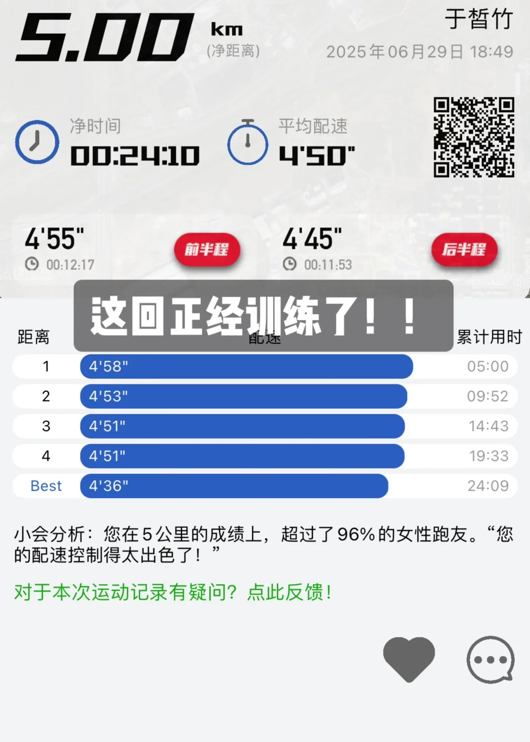 🏃♀️28度🔥夏训5km,配速4.50