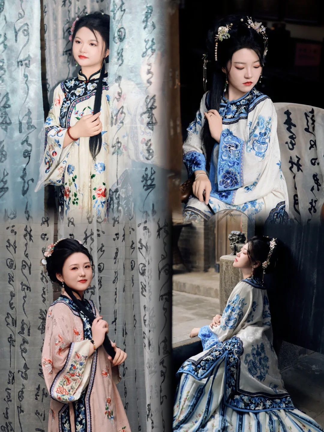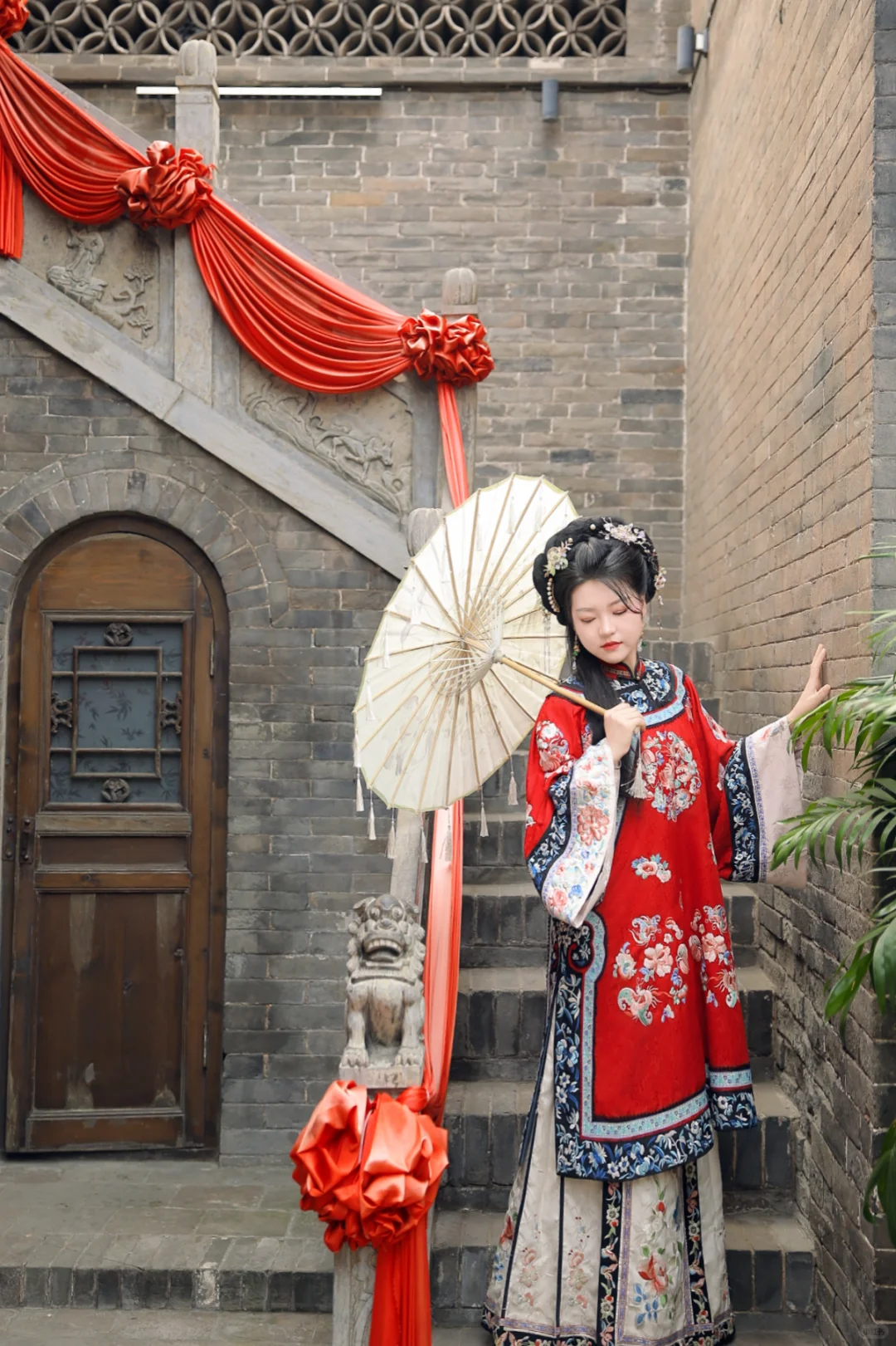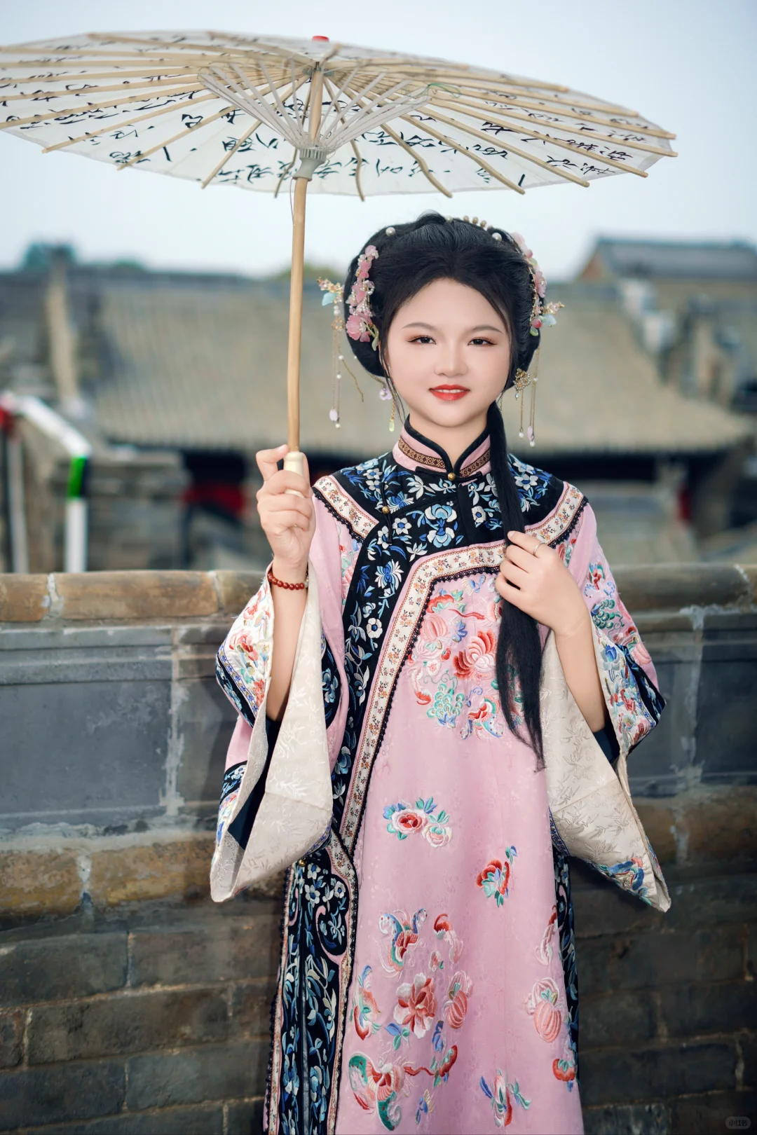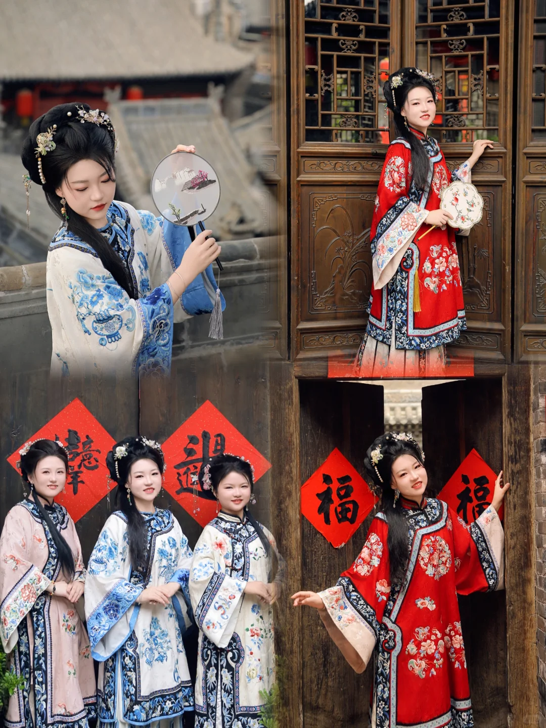 🌈Tips\n💙时间:中秋假期\n💙地点:平遥古城\n💙写真:晋商大小姐\n🌈Memory\n💕平遥古城里晋商少奶奶、晋商大小姐写真店层出不穷,以自己浅显的理解,这两种造型最大的区别就是前额是否留一撮整齐的前脸儿\n💕从小时候看的《哑巴新娘》,到后来孙俪演的《那年花开月正圆》一直不理解为什么前脸儿那么规矩那么齐平,后来查资料说晋商少奶奶作为家族中重要角色,着装打扮必须遵守严格的规范要求,整齐的刘海儿非常符合当时的审美潮流,彰显女性的端庄、秀丽、温婉\n \n💕Anyway还是更喜欢大小姐妆造,于是在短视频平台上搜索一番,最后锁定武德第旅拍馆。和大多数写真店一样,进店流水线服务:妆造——服饰——拍摄——选片,妆造时候一般会绑很多假发,如果不想太厚重可以提前沟通\n \n💕我选的是蓝白色衣服,头上带蓝花,给我化妆的小姐姐上来就给戴个大红花,跟她沟通被告知没有蓝花,最后索性不管了,说自己喜欢什么就自己去找吧(最后选片的时候,隔壁电脑里的照片戴的就是蓝花)\n \n💕除了妆造不愉快其他还可以,拍摄场地在隔一条街的后院,拍摄过程中跟摄影师吐槽了化妆师,可能出于情绪安抚,摄影师更用心地拍了几张更有个性的照片。最后就是选片,现在看磨皮有点夸张,不过总体上还是比较新鲜的体验,试试不同妆造,记录下不一样的自己#晋商写真 #平遥古城#晋商大小姐造型 #晋商少奶奶写真 #晋商大小姐写真 #古风妆造 #闺蜜照 #闺蜜装