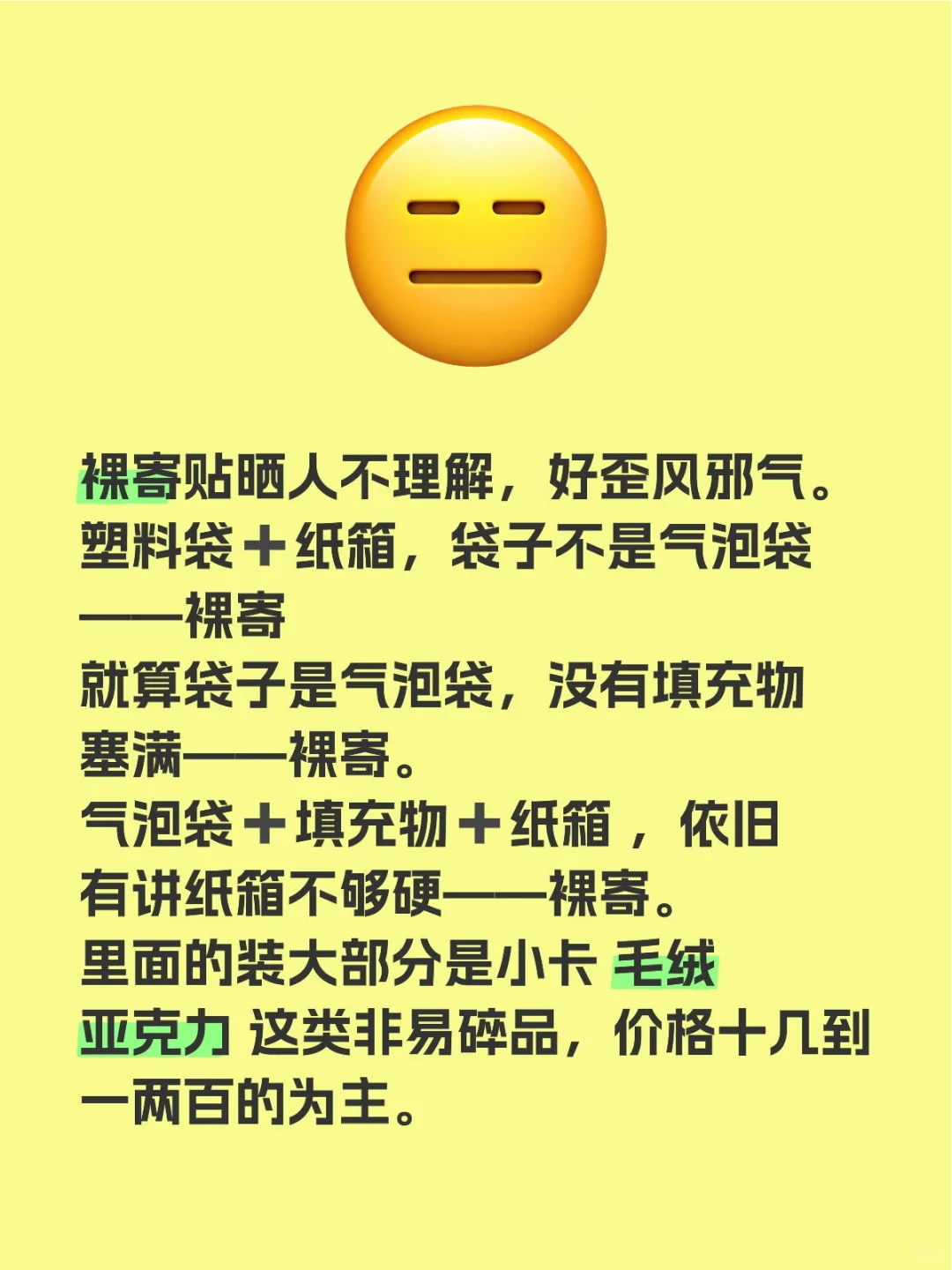 裸寄贴大部分是小卡 毛绒 亚克力 这类非易碎品,晒裸寄贴 大多数二次元和追星人,我也算勉强沾边的圈子,依旧理解不了,吐槽贴里东西大部分是十几块到一两百东西至于对包装这么苛刻吗?官网寄出来的都未必符合这些严格包装要求。