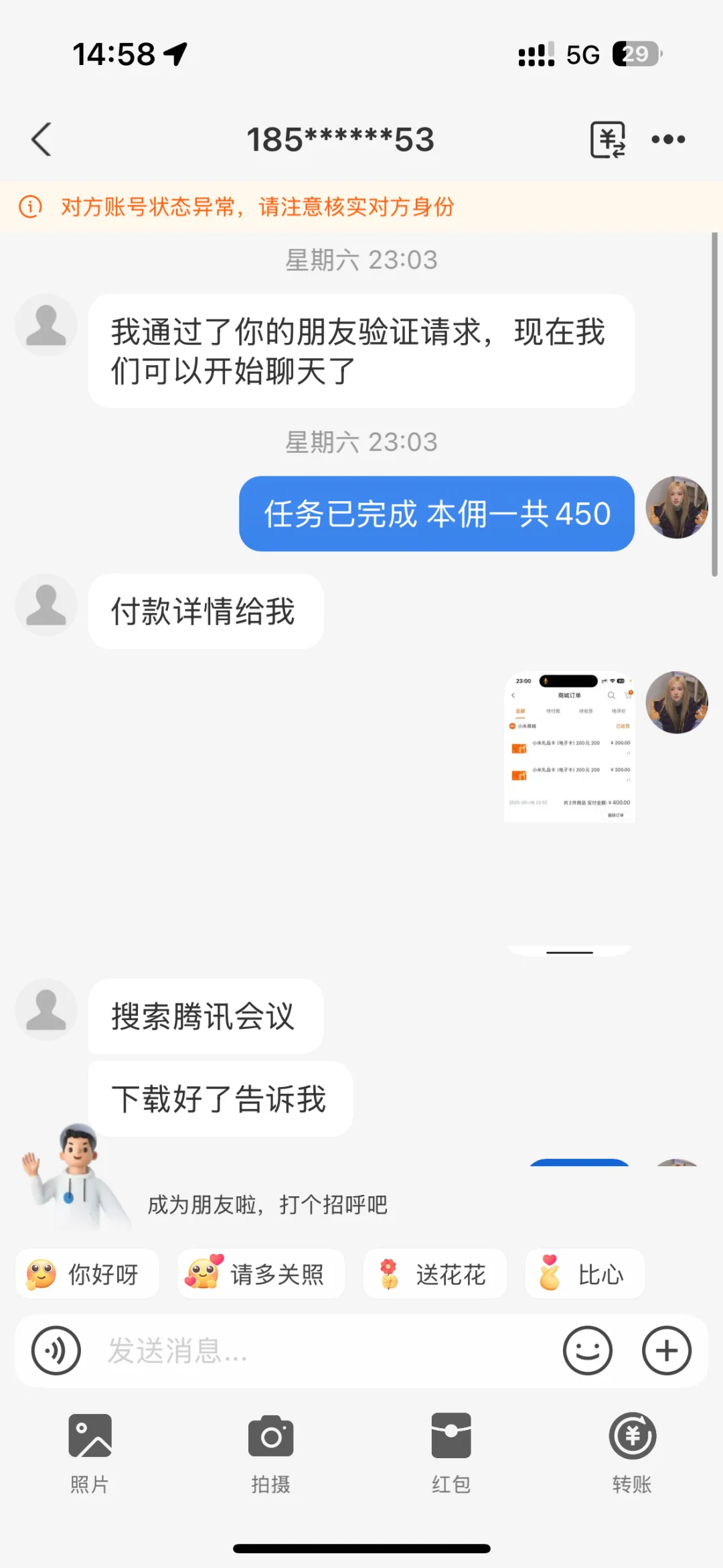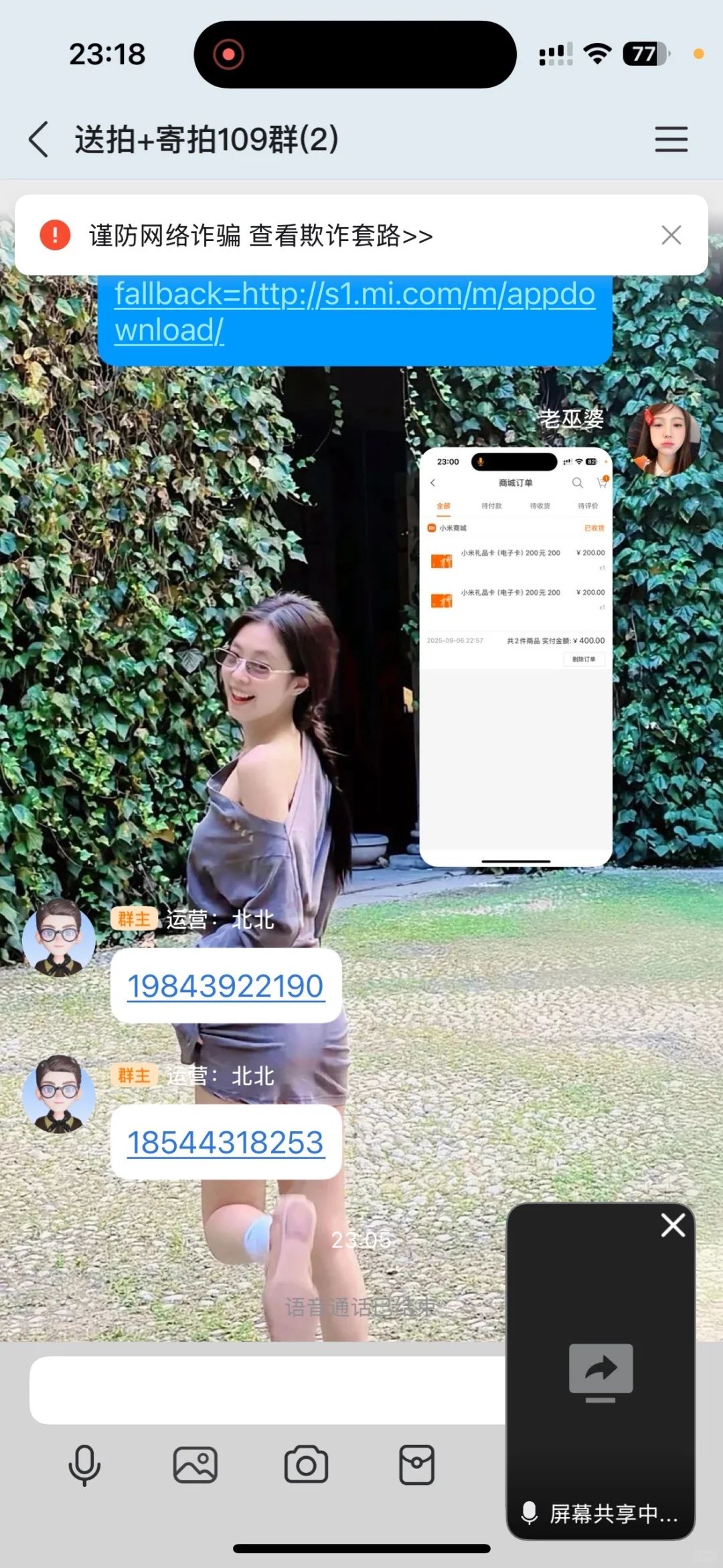 去年 d 🦅➕的我说是做寄拍的 加了 v 了解了发现得先入会,入会要299r,之前不是很想赚这个💰所以觉得麻烦且不可信,但是她 puq 我是一直有看到,并且也有那种以前有担心之类的没有加入,但是后面还是选择加入了这种,所以到今年实习了缺💰想赚💰就选择了再次联系她。因为真的想赚💰所以毫不犹豫的付了会费,并且按照要求下载了 app(微脉圈)然后要求进 qq 群培训,然后就加了。那个 qq 群是只有群主一个人发了一系列的内容并且群内是禁言的如 p2(帽子叔叔说这很可疑)群是晚上才通过进入的(现在合理怀疑是专门挑的晚上)群里的内容当天晚上太晚了就懒得看想着第二天白天再看吧,结果这时有一个冒充群主的人(头像已经名称和群主一模一样)来加我如 p3,我秒通过,并且按照他的指令进行各项操作,先是问我模卡通过了没有,然后再让我进群选款,这时群里又有人➕我,让我把选好的款发他,他再教我去🍑识别下单等等如 p4,下完单马上让我把手机尾号以及订单发他核实地址等等,再退款,然后他说去联系专员给我发货并且告诉我接下来该怎么操作。然后那个专员直接打电话过来,教我进行一系列操作,并且语速非常快,后面突然跟我说要我下载小米商城,进行另一个任务,然后进去先收藏加入购物车了一个鱼缸,还让我购买礼品卡如 p5,然后非常快的催我把礼品卡转赠给他,我一下就笑出声了,我说那我就把这400水灵灵的直接送泥了呗…但是他就是非常无语的说什么我们几万人呢不差泥这几百巴拉巴拉的,然后一直催我快点快点,我当时应该被洗脑了,然后就转了 p6。后面他就说这单本佣450,让我去➕一个人 zfb 账号,他会返回来什么的。结果那个人账户是异常的,他解释可能➕的人太多了,然后让我➕了另一个,还和我铺垫说第一次返💰要登记,会很麻烦什么的。这个 zfb 账号通过了之后我先是给他发了消息如 p7.8,他后面让我加他 qq,然后在 qq 邀请我加入他的直播频道,然后让我共享我的屏幕去 vx,zfb 余额账单明细之类的都给他看(到现在我还没怀疑一点也是…🥲🥲后面帽子叔叔说这种共享很危险,如果绑定银行卡,验证码发过来就能看到喵的)然后还让我从银行卡里转钱到余额里面来确认我有多少💰,我当时就觉得不对劲,但是骂骂咧咧的还是照做(就是特别奇怪的心理,就想着赶紧赶紧搞完去睡觉)然后我就是一直在边骂他(后续发 plq)