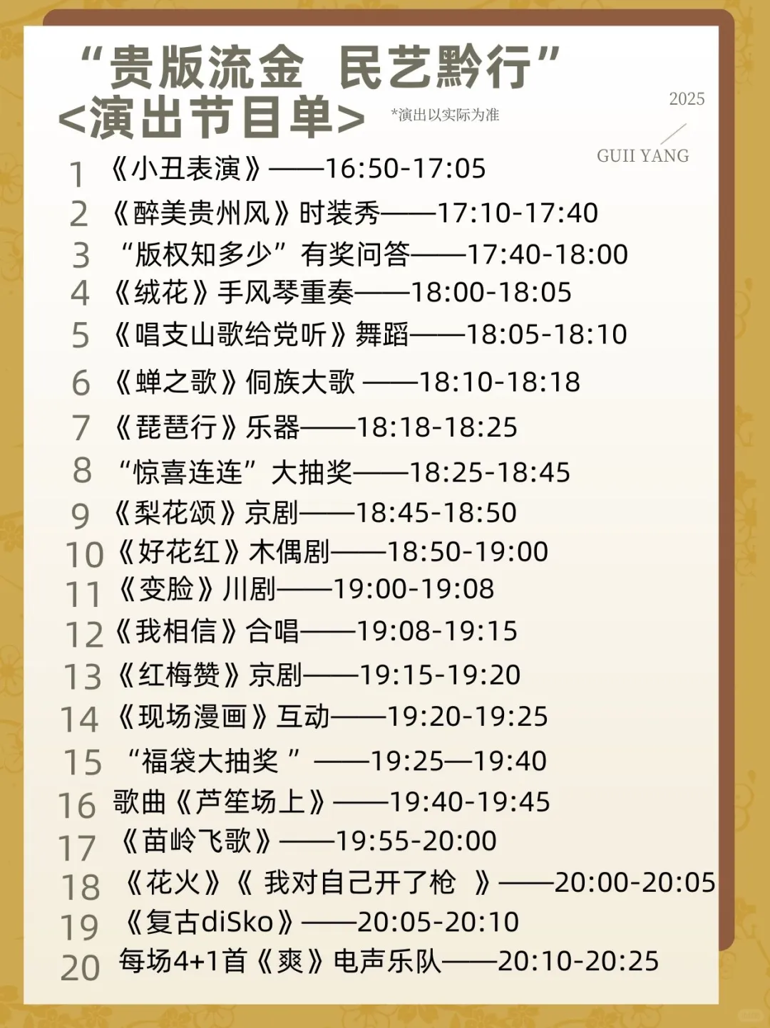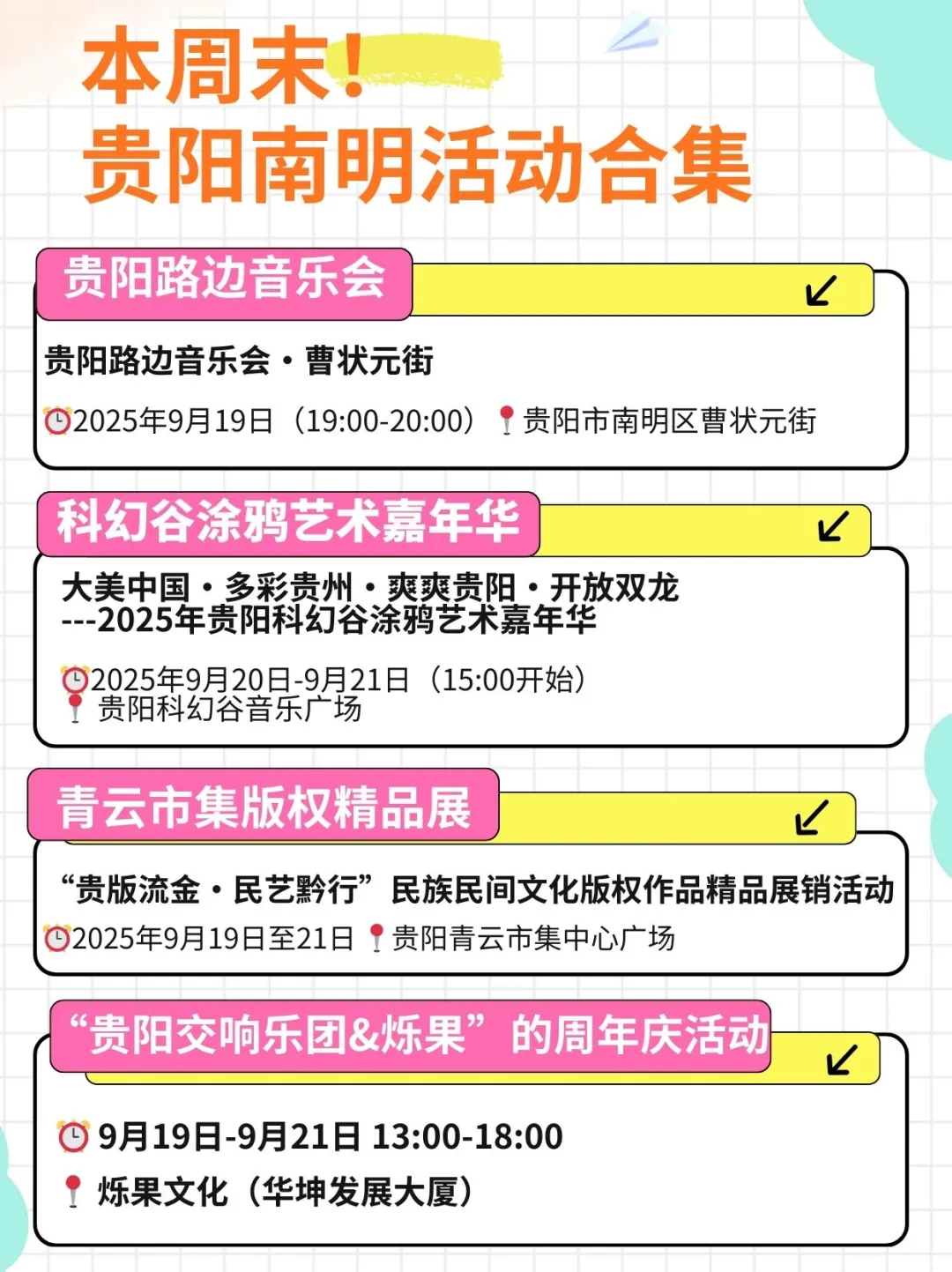 🎉这个周末来贵阳南明包嗨的!\n民乐盛宴×涂鸦狂欢×非遗市集×密室寻宝\n多项精彩活动同时开燥\n带你玩转不一样的周末🥳\n—————————\n✅贵阳路边音乐会·曹状元街(古风秋韵夜)\n⏰9月19日 19:00-20:00\n📍曹状元街\n✨ 古韵悠悠的状元楼戏台上\n民乐女团惊艳开麦,12首国风金曲连唱\n《青花瓷》《知否知否》《琵琶行》等轮番登场\n古韵旋律搭配状元楼的夜景\n氛围感直接拉满\n💡曲目单可见P3\n—————————\n✅ 大美中国·多彩贵州·爽爽贵阳·开放双龙\n——2025年贵阳科幻谷涂鸦艺术嘉年华\n⏰9月20日-9月21日 15:00开始\n📍贵阳科幻谷音乐广场\n🎫门票:免费\n可凭工作人员发放手环入场\n(部分体验项目与生活市集项目需付费)\n \n👉 六大主题区 承包你的快乐:\n1️⃣ 机甲光影秀\n全省首个巨型机甲光影秀‼️\n🤖看机器人现场作画,科技感爆棚\n \n2️⃣ 涂鸦比赛/互动区\n国内顶尖涂鸦大师现场创作\n也能参与“全民共创涂鸦墙”活动!\n \n3️⃣ 科幻NPC打卡区:集章任务,赢限量好礼\n \n4️⃣ 人体涂鸦/DIY体验区\n现场知名涂鸦艺术家,帮助你成为\"行走的艺术品\"\n专属DIY区,有帆布袋、T恤等\n以及各色环保颜料与画笔,邀你来创作\n \n5️⃣ 生活市集&能量休憩区\n非遗+文创+美食一站式体验\n \n6️⃣ 音乐派对狂欢场\n活动期间,DJ&乐队带你嗨翻秋夜\n🎁还有集赞赢福利等活动→可见公众号“天眼星城”\n————————\n✅ “贵版流金·民艺黔行”\n民族民间文化版权作品精品展销活动\n⏰ 活动时间:9月19日-9月21日\n🌟 演出时间:9月19日15:30开始\n9月20日-9月21日 17:00-20:00\n📍 青云市集中心广场\n \n✨蜡染、刺绣、民族玩偶等文创集中展销\n每件都带着浓郁地域特色\n√ 每日还有民族歌舞表演\n√ 非遗技艺现场展示\n√ 手工艺互动体验\n√版权知识问答环节\n🎁150份礼包等你来赢\n…\n活动内容超丰富\n📜演出节目单 见→P10\n——————\n✅ “贵阳交响乐团&烁果”的周年庆活动\n⏰ 9月19日-21日 13:00-18:00\n📍 烁果文化(华坤发展大厦)\n🔥 密室爱好者集合!4层空间沉浸式寻宝\n✅ 免费参与!全程0费用!脑力值MAX挑战\n✅ 个人/组队均可参与\n✅ 完成终极任务赢惊喜礼品\n🎯 报名方式:公众号\"烁果文化\"预约\n脑力达人们别错过~\n \n这个周末来南明\n古风、科幻、民艺一键打卡\n💝收藏这篇攻略,周末一起嗨起来~\n#爽爽贵阳甲秀南明 #南明文旅 #周末去哪玩 #非遗文化 #涂鸦艺术 #贵阳路边音乐会 #贵阳