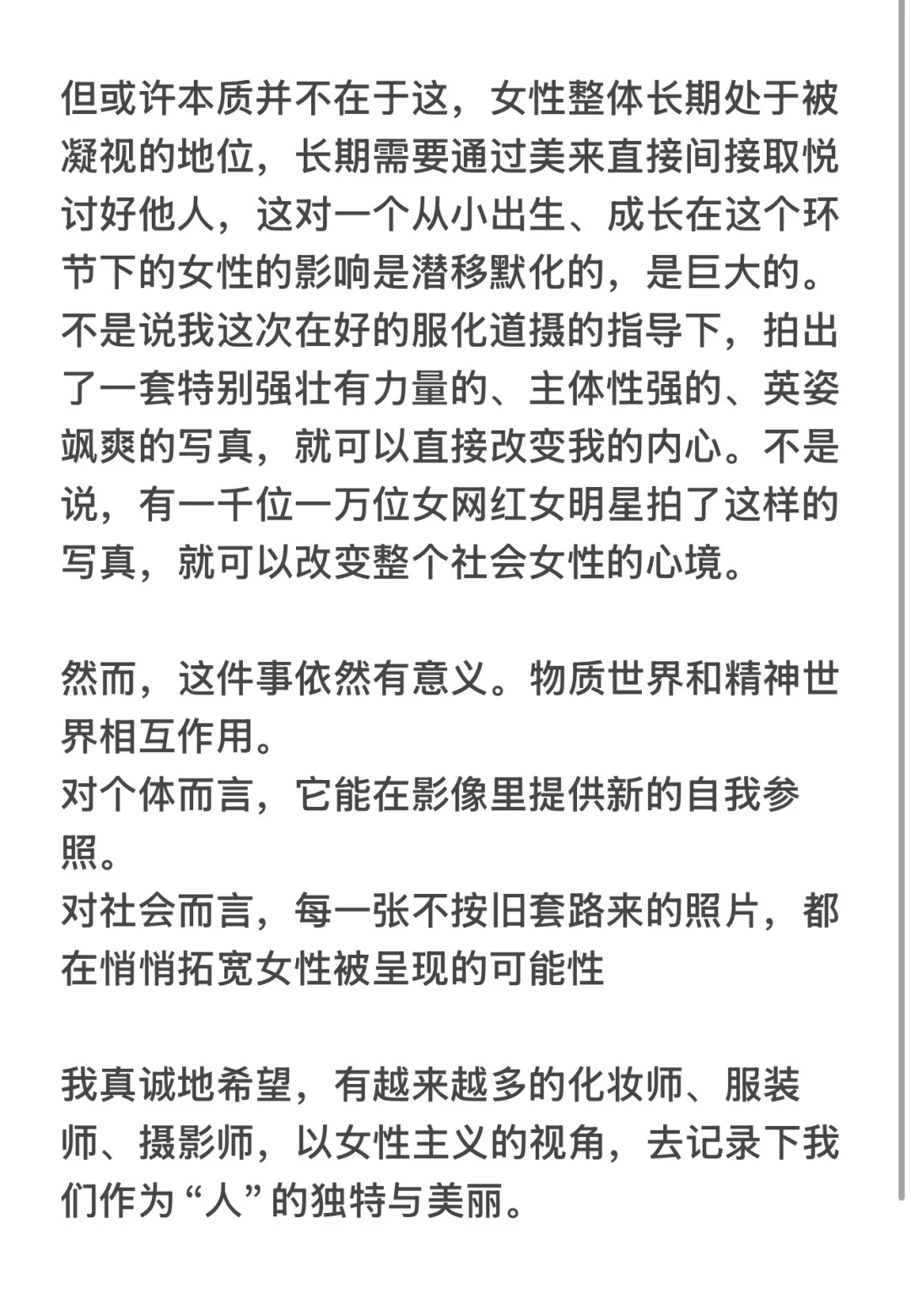 最近突然想拍套写真,翻了很多家拍摄机构的客片例图,大多并不能激起我的欲望。\n先说价格在3000 以下。不论名字:纯欲、姐感、法式、甜美、轻私房、港风、肖像、情绪、光影、少女、日系、森系、生日、圣诞……几乎无一例外,服化道都是高露肤度,妆容是清纯幼态或公式化的,抹平了个人的棱角和质感。动作表情千篇一律:向上看的眼神,咬嘴唇、咬手指、咬花,俯拍视角,或仰拍对准腿,常见的姿势还有跪姿、趴腿、俯身、手臂交叉。很多服装甚至接近情趣内衣,动作指导也围绕着露肩膀、露腰、露腿,后期 p 白细。\n机构更在意的是出片率,即大众觉得好看的安全姿态,而不是每个人的独特气质与主体性。\n \n我不想鉴擦,很没必要。只是觉得面对自己花钱买来的服务镜头,还是要展现出这样的讨好感,真的令我很难受,我不想被这样装扮和引导。固然,如果一个人自身气场极强,不论怎么拍都能撑起主体性,但大多数人并非如此,包括我,一位长相普通的女孩,背后的的服化道、拍摄动作表情引导和摄影师的内在思想很重要。\n \n我清楚市场上大部分是流水线糖水写真,几百到一两千就能搞定。因此,我更心仪美式、港风之类相对不那么柔的风格,或许能更接近我想要的感觉。当然,我也知道自己并非刘晓庆巩俐那样的飒,做不到 100% 大女主。所以想借拍一两套写真,满足一下自己,也希望外在的呈现能反过来影响内心。\n \n价格在3000 以上的作品,服化道和背景的确更精致,不那么流水线,能针对个人气质进行塑造。但即便如此,不论价位,女性的露肤度依然偏高。有人说,你可以选择不穿短裙短裤,不穿紧身衣,这是自由。嗯,我认为,在大量客片例图里大部分都是高露肤度的情况下,也就是大数据概率下不谈个人自由选择。\n \n价格高一些固然能买到更多个性化,但并非绝对,有些只是更高级的讨好。真正能打破这种框架的,在于拍摄主体本人,以及背后化妆、服装、摄影师的思想与沟通。\n \n我在思考,有没有写真是不刻意拍女性的,就是拍人,强化展现我作为人,自然人、社会人、事业人、学生人等等的特点风格。我仔细一想,居然不知道不刻意对准女性特质,女人还可以怎么拍,有哪些表情、姿势、风格不讨好呢,可如果这样框定,无非就是另一个枷锁。不以去女性化为目标,而是允许多面性。\n写不下了,图 2。\n#美并不是拍照的最终目的 #写真 #比美照更重要 #拒绝流水线式拍摄 #客体化#凝视